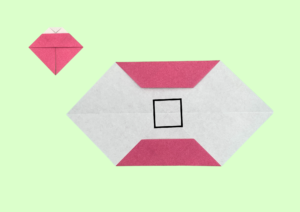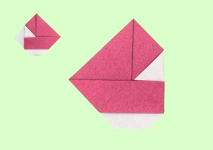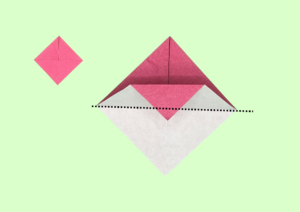 ⑤ 台形の部分を両面とも下に折り、ひっくり返します。そしたら図のように小さい台形の上辺に向かって、頂点を折り下げます。次に台形を残して開きます。中心に小さな四角形の折り目が残ります。