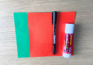 ① 折り紙(緑、赤を1枚ずつ)とペンとのりを準備します。