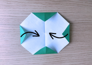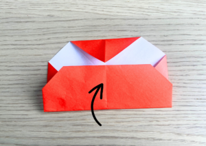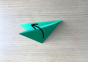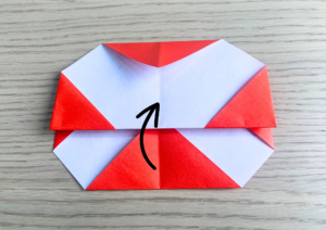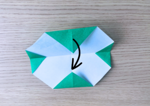 ⑨ 上の逆三角の頂点に少し被るように下から上に折り上げます。