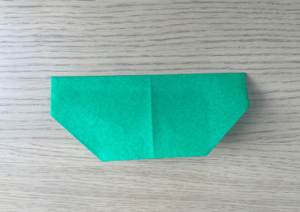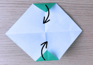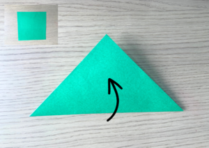 ② 緑色の折り紙を三角に折ります。