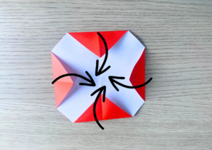 ⑦ 赤色の折り紙を最初の②と③の工程と同じように三角に二回折って、折り目をつけます。