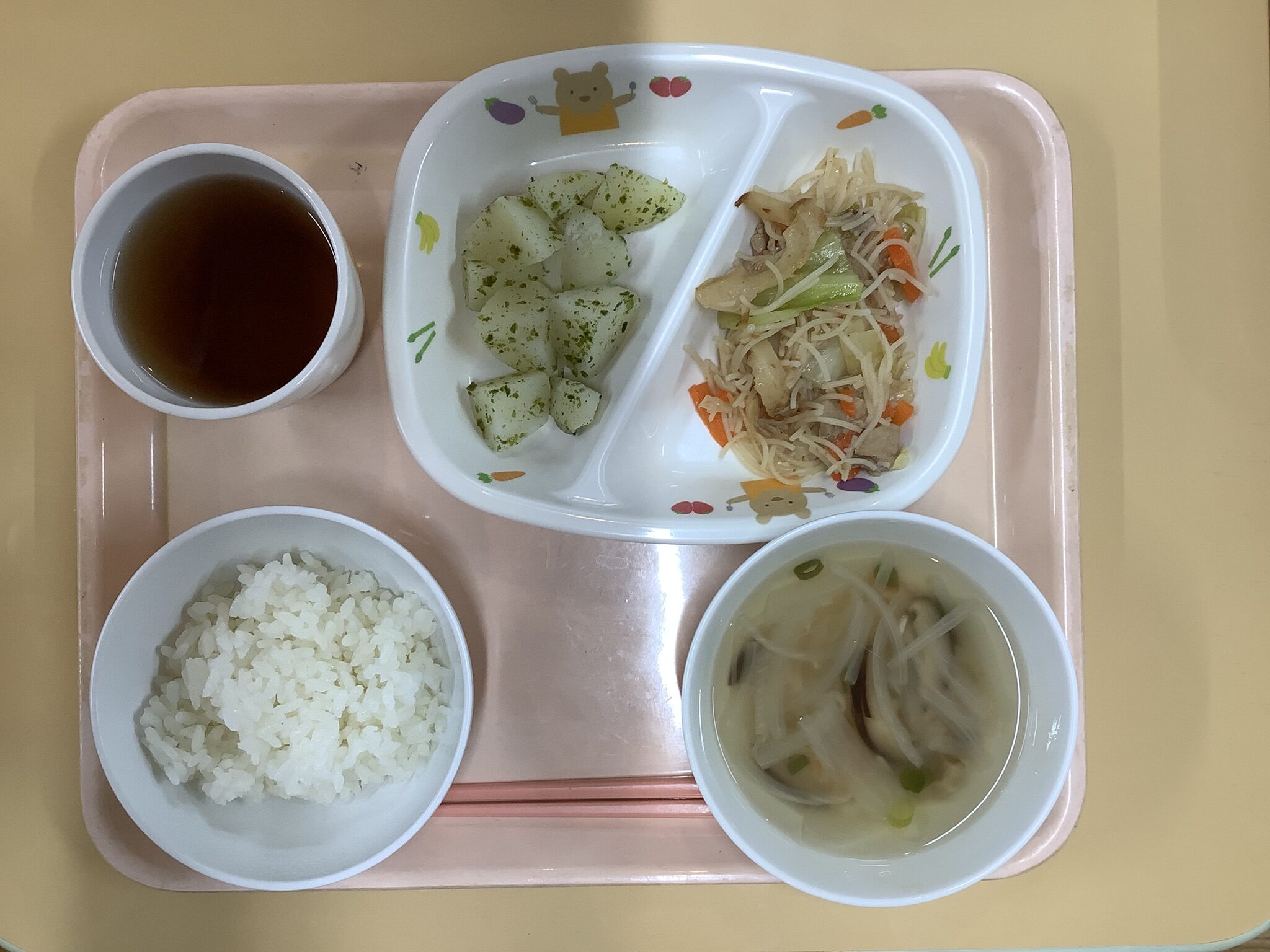 ご飯、ビーフン、青のりポテト、カニカマと椎茸の中華スープ