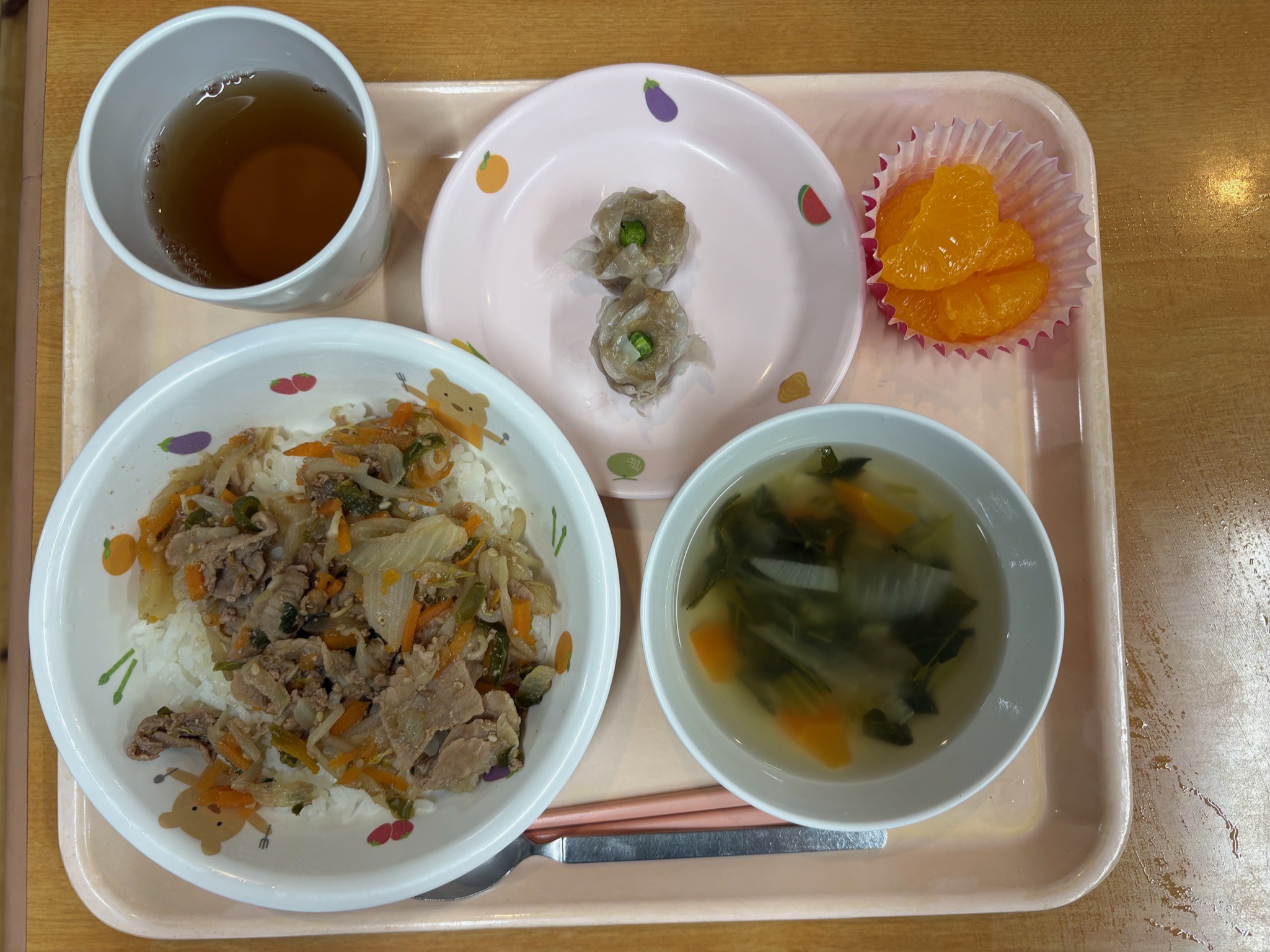 プルコギ風丼、蒸ししゅうまい、チンゲン菜の中華スープ、みかん缶詰