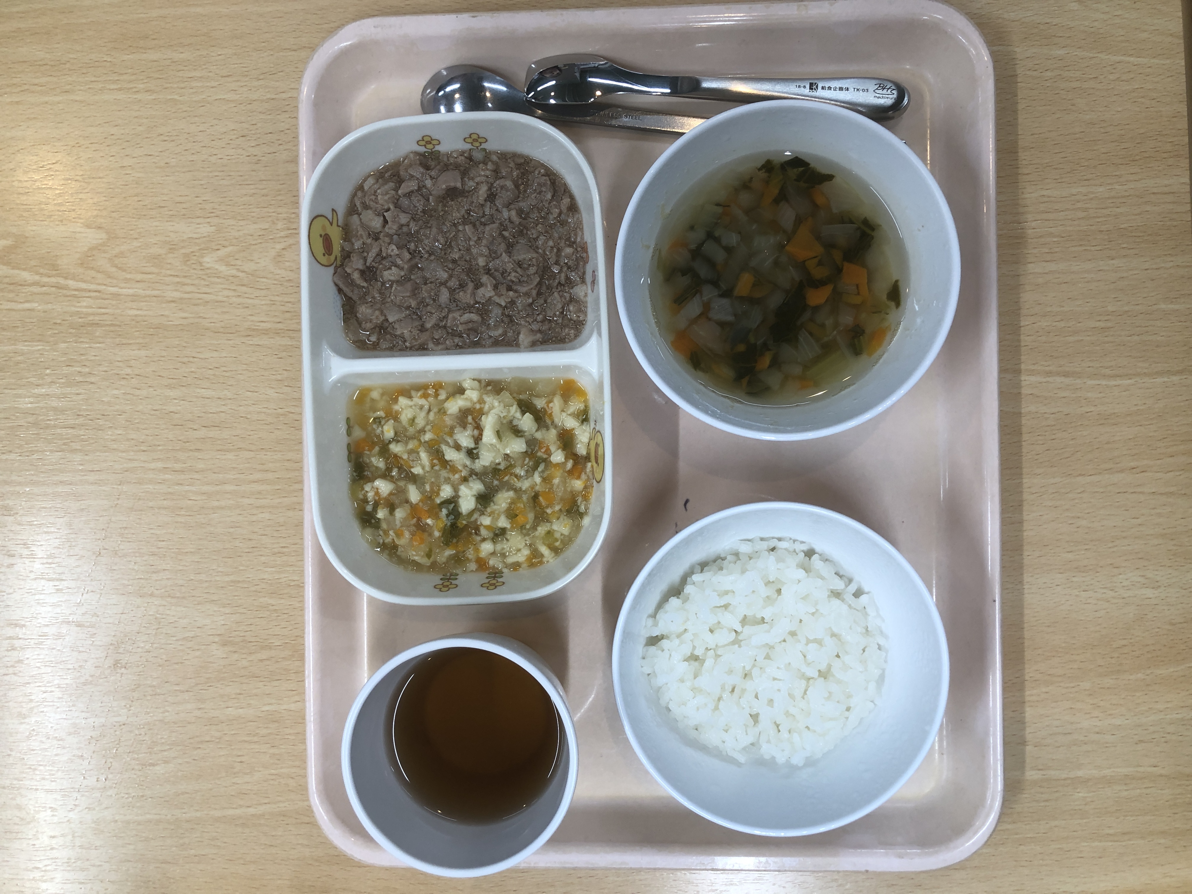 ご飯、豚肉のとろみ煮、豆腐の煮物、チンゲン菜のスープ