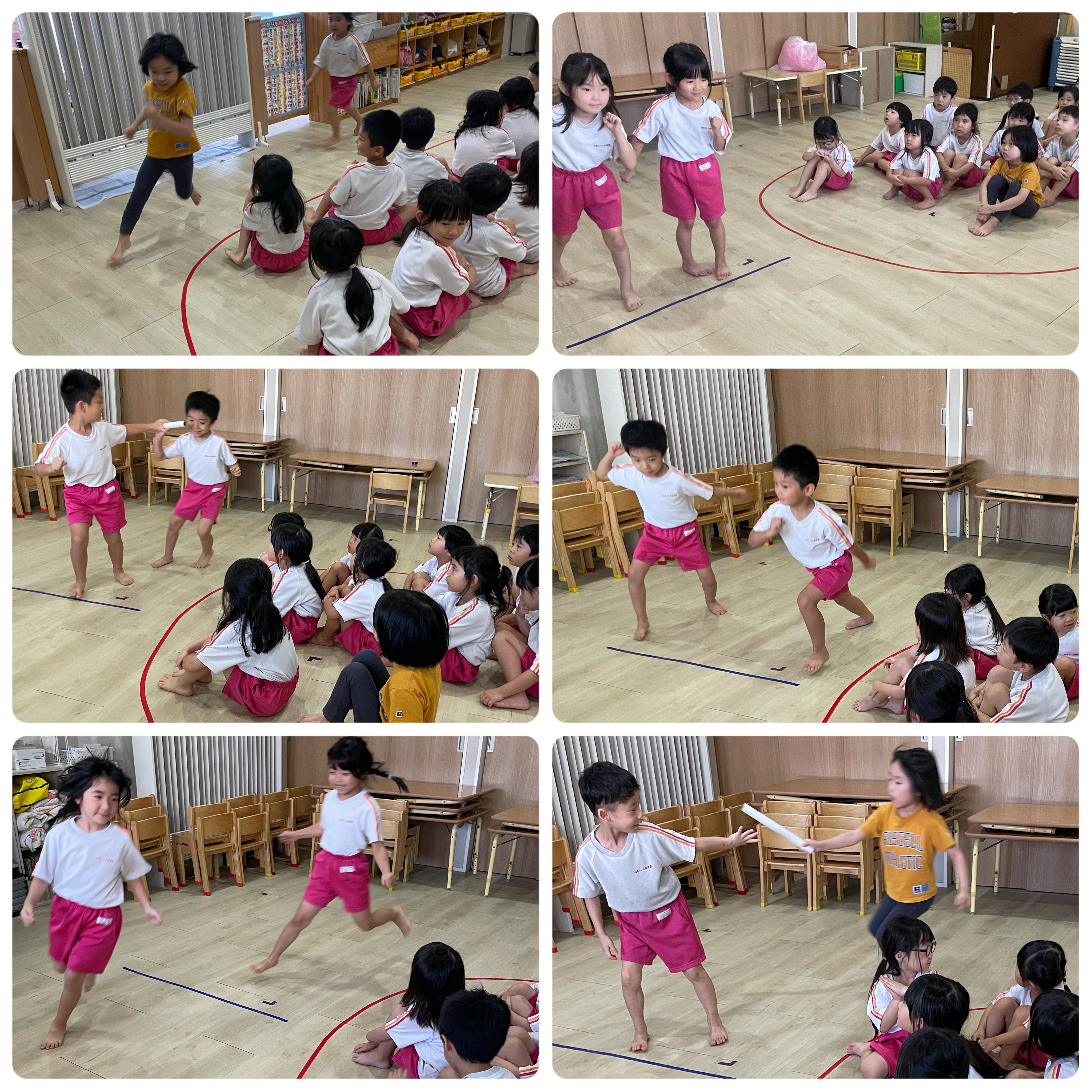 あおぞら、にじ、ひかり組さんはかけっこの練習をしました!いちについて〜よーい、ドン!の掛け声でバトンもしっかりもらって頑張りました♬