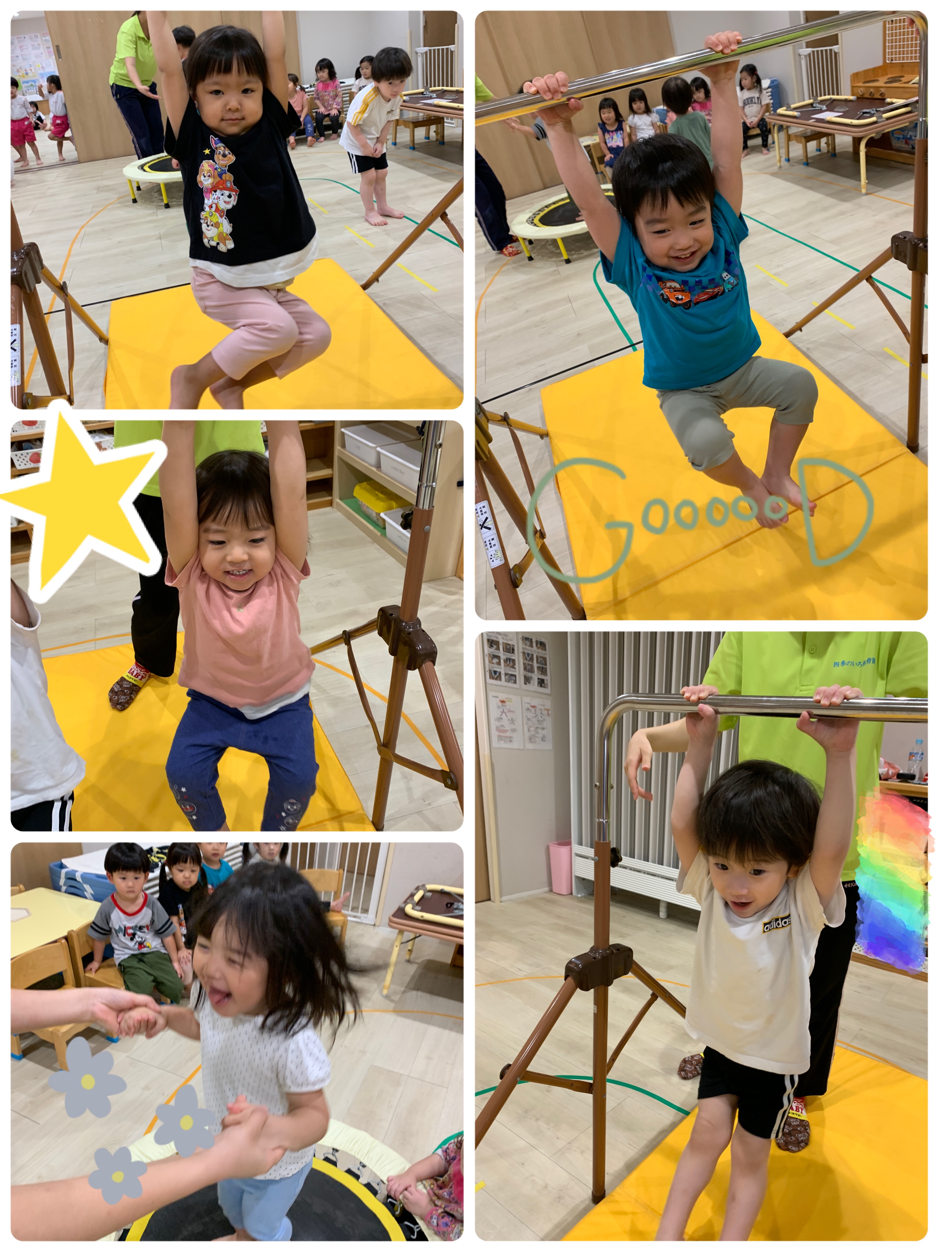 鉄棒にぶら下がったり、トランポリンを連続して跳んだり、たくさん体を動かしてとっても楽しそうでした☺💕