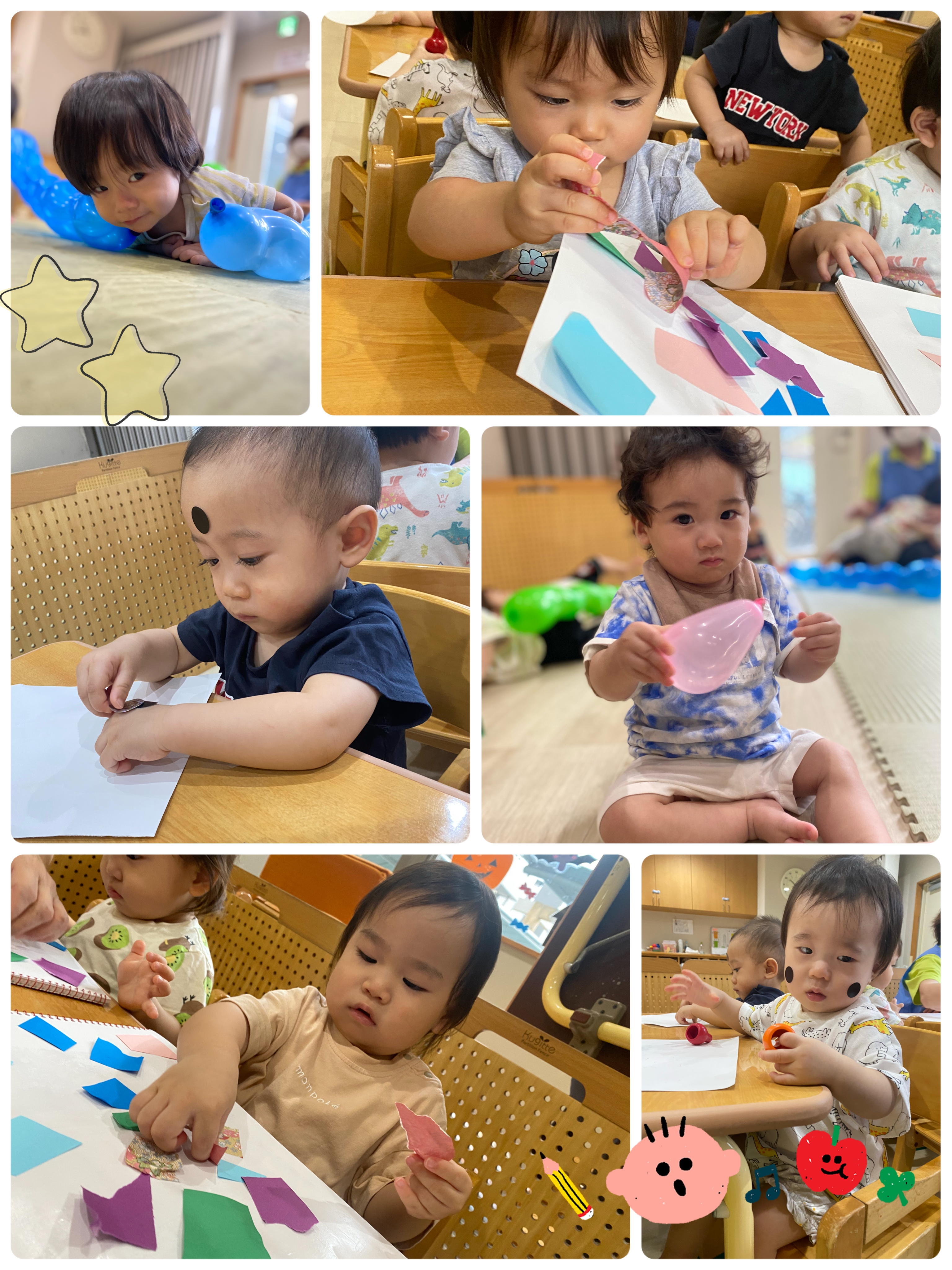 ぷにぷにとした風船の感触に夢中なったり、細かく切られた色画用紙を貼ることに一生懸命の子どもたちでした☆
