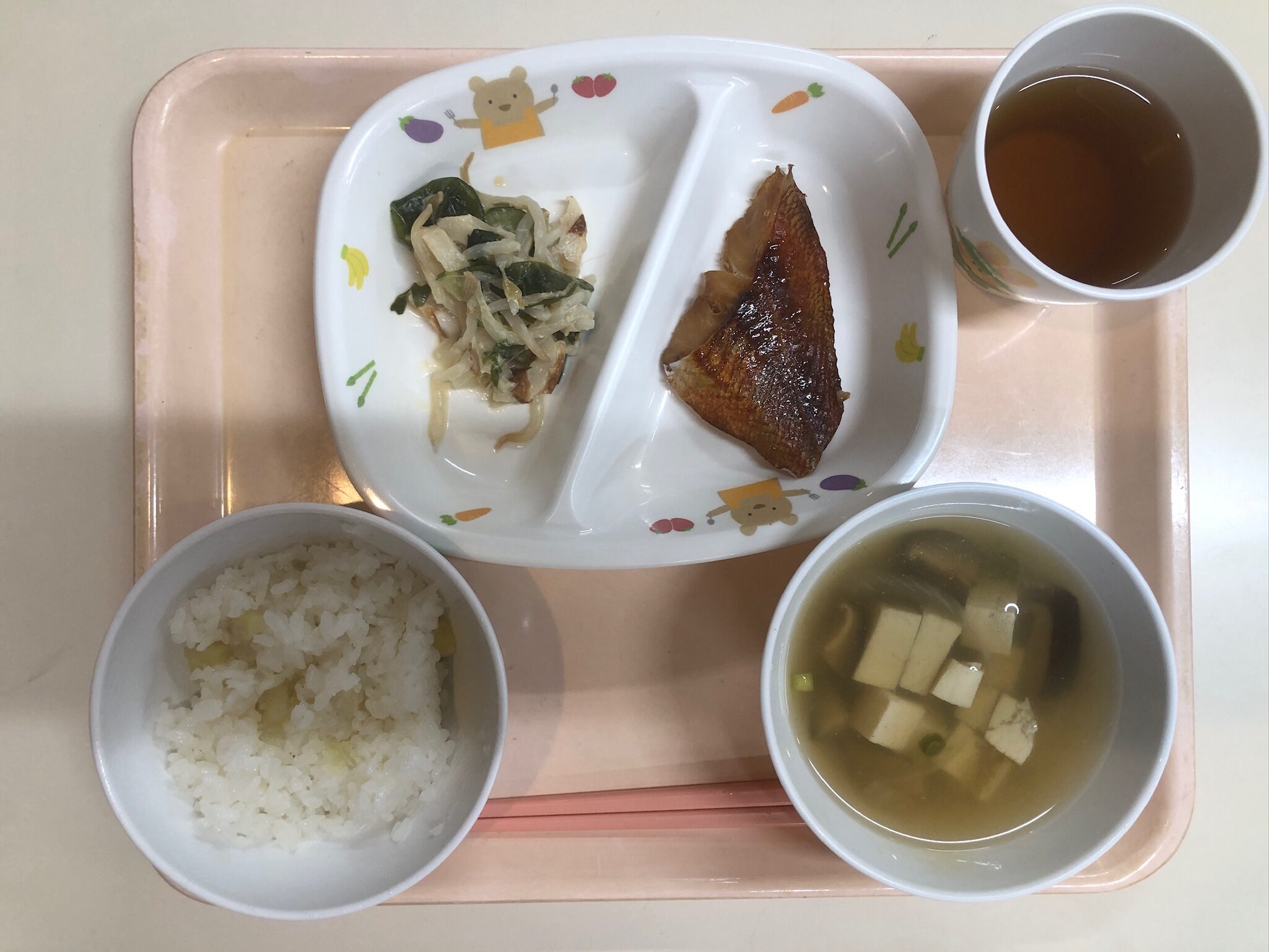 さつま芋ご飯、赤魚の照り焼き、きゅりと竹輪の味噌マヨ和え、豆腐のすまし汁