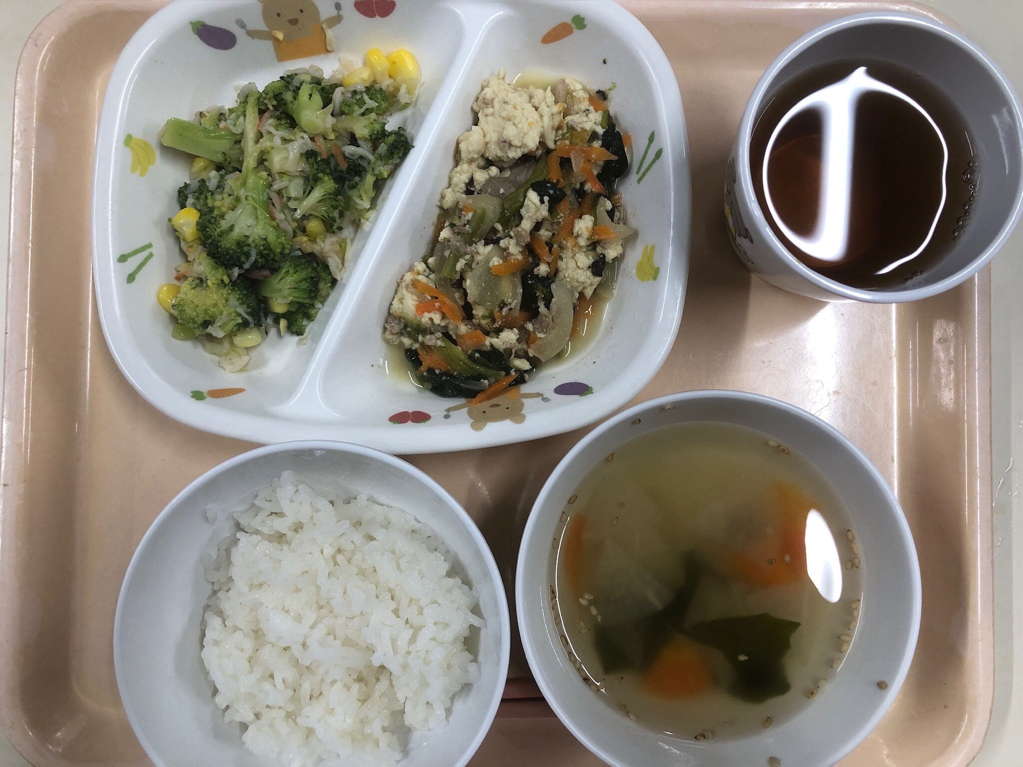 ご飯、豆腐チャンプルー、ブロッコリーサラダ、大根の中華スープ