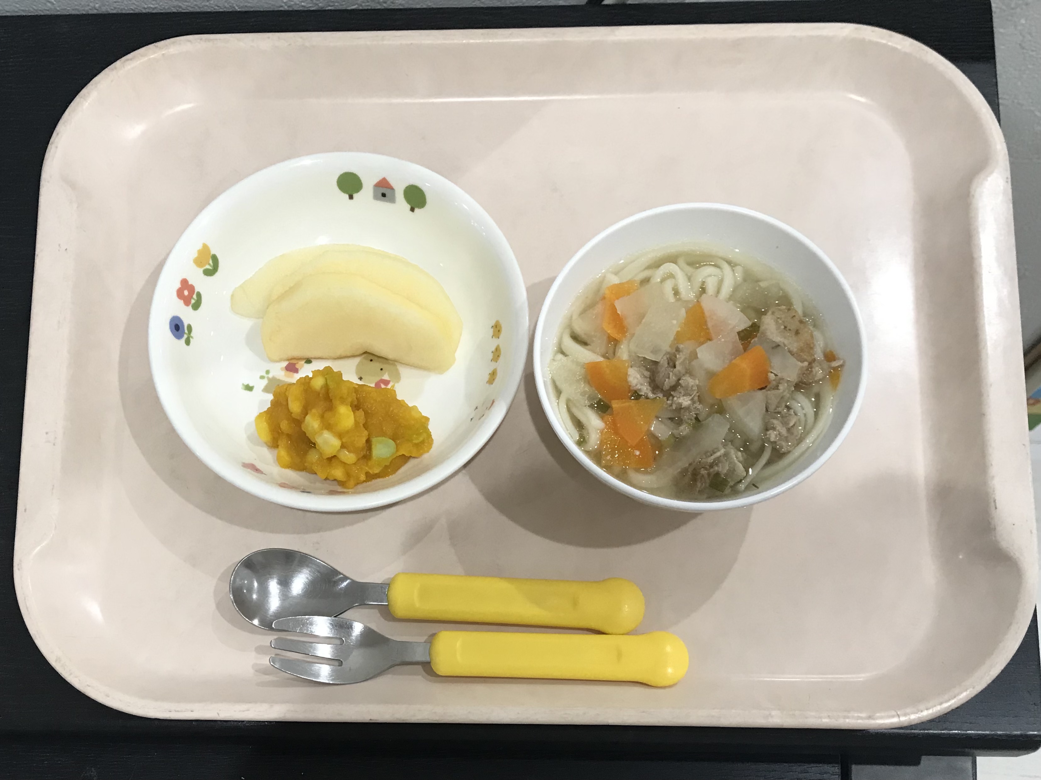 とん汁うどん、かぼちゃサラダ、りんご