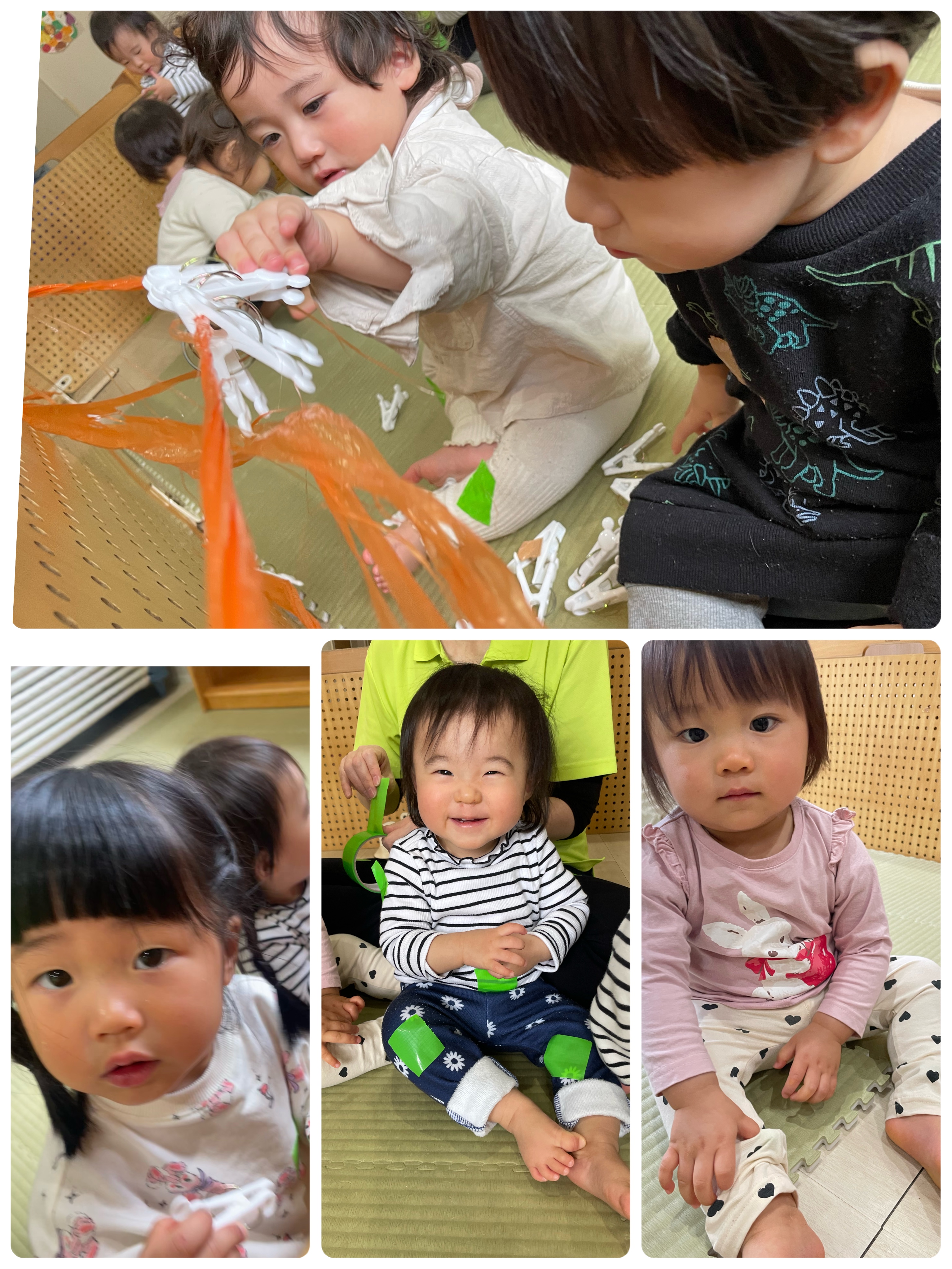 また、洗濯バサミ遊びでは引っ張って取る動作を楽しみ、指先の動きもぐんと発達している様子が感じました!