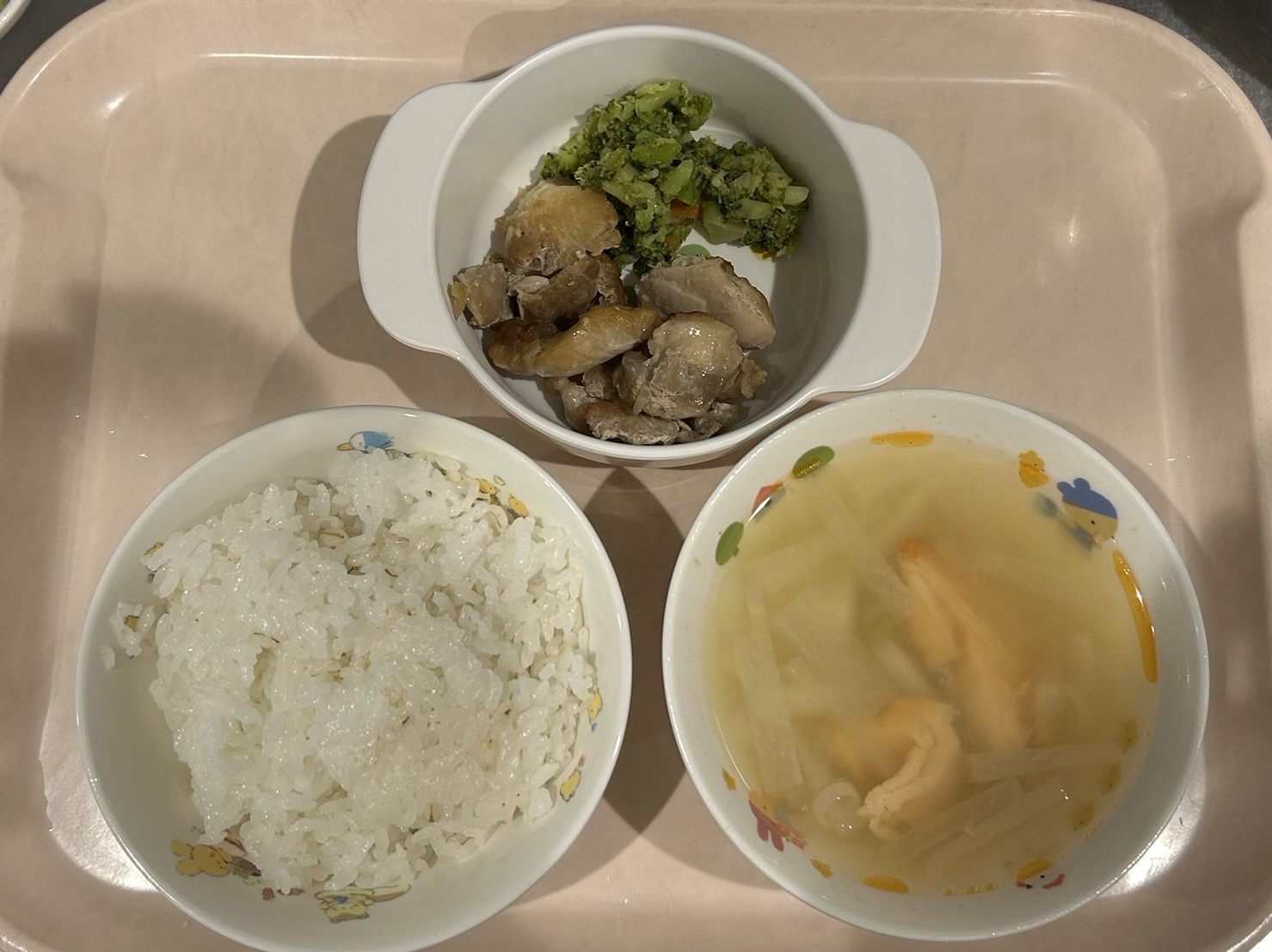 麦ごはん、石狩汁、鶏のレモン焼き、ブロッコリーとにんじんのおかか和え