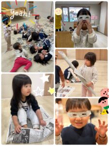 お友達が考えたポーズを真似っこするゲームでは、しっかりポーズを再現できていました☺頑張ったあとは、園長先生からみんなに新聞紙シャワーです!!