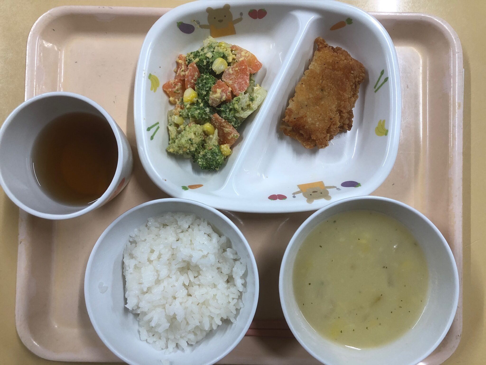 ご飯、フライドチキン、ブロッコリーサラダ、ポタージュスープ
