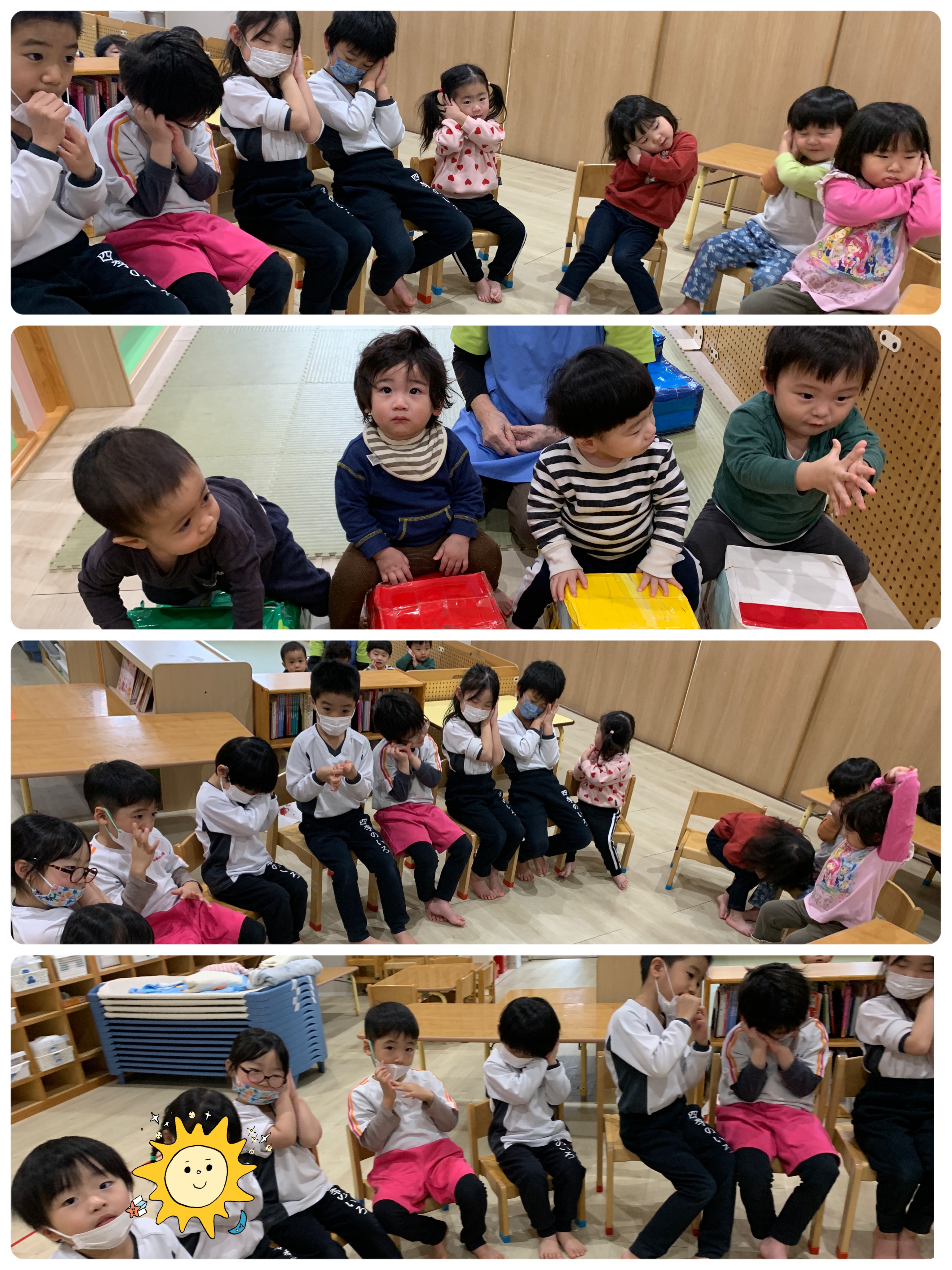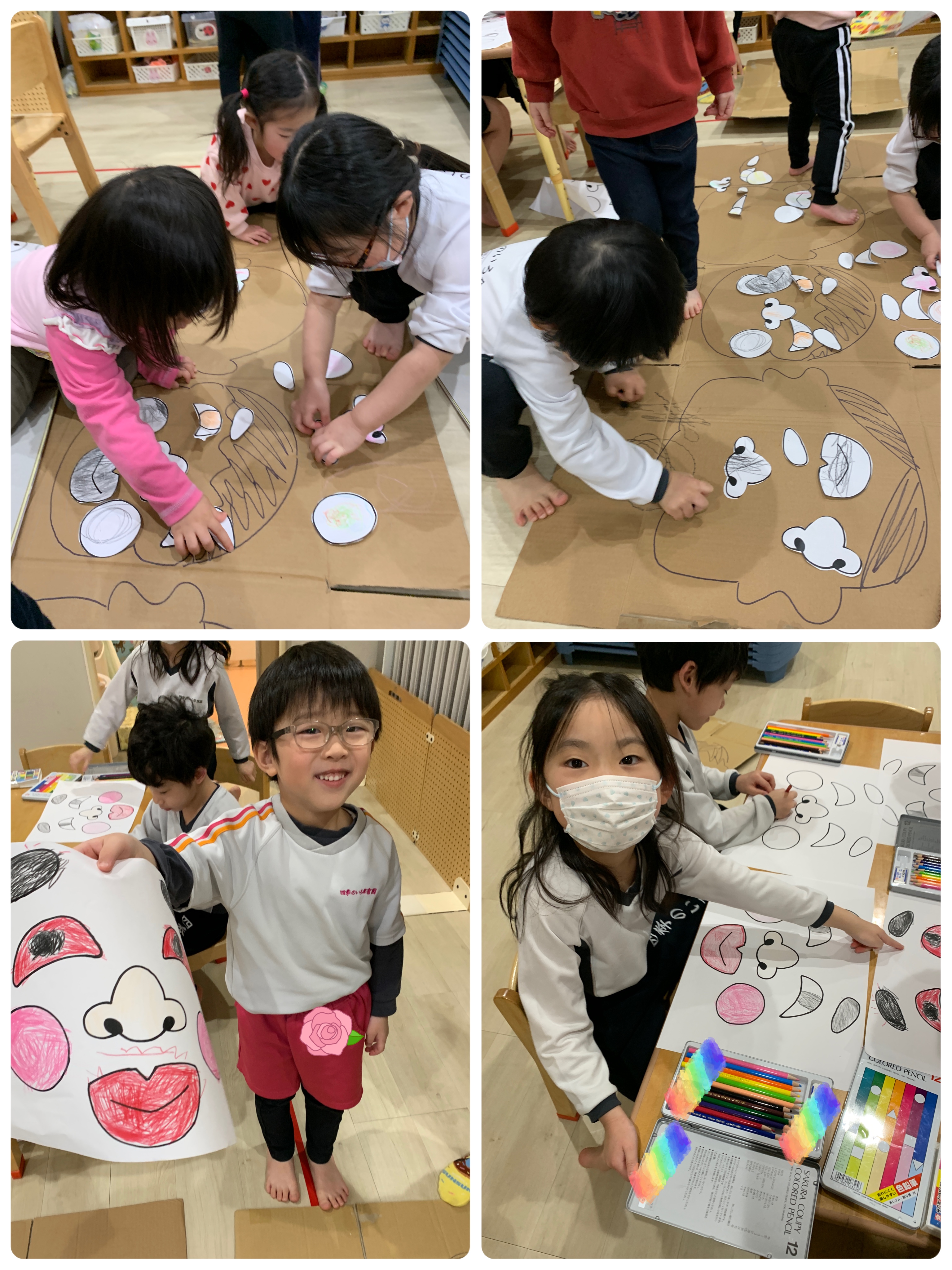 今日は登園しているお友だちが少なかったため、みんなで同じお部屋に集まって、ゆったりとした時間を過ごしました♪「福笑い」では、「ここかな?」「ちがうよ〜!」と笑い声が響き、できあがったお顔を見てみんなで大笑い😆
