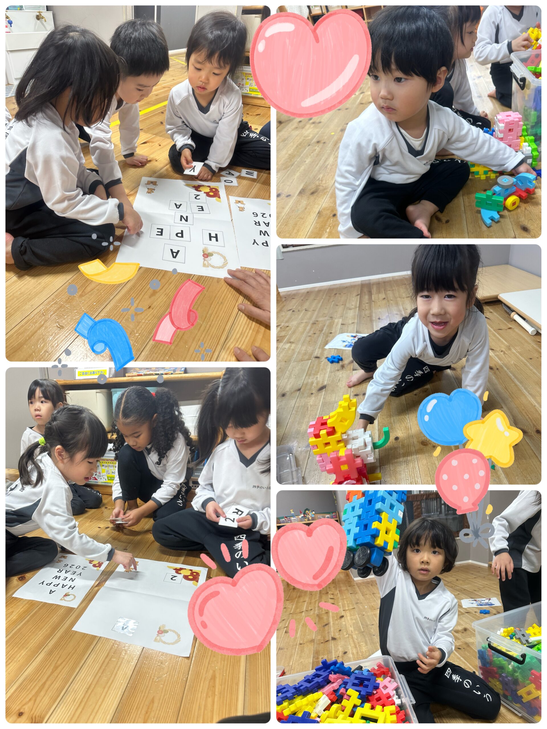 そのあとはハッピーニューイヤーの綴りの見本を見ながらみんなでアルファベットをひとつずつ組み合わせ、完成させましたよ😊
