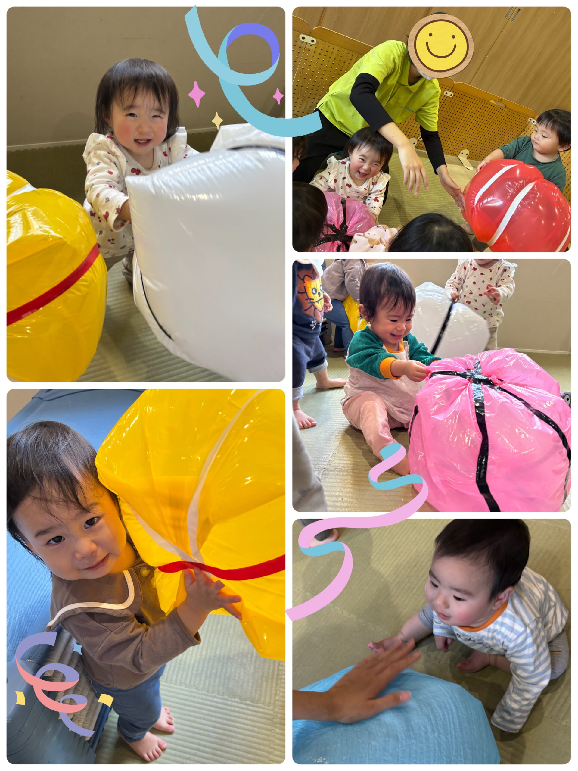 連休明けのお友達も元気に登園してきてくれました🌟今日のおひさま・ほし組さんは、カラーポリ袋で作った大玉遊びをしました!!