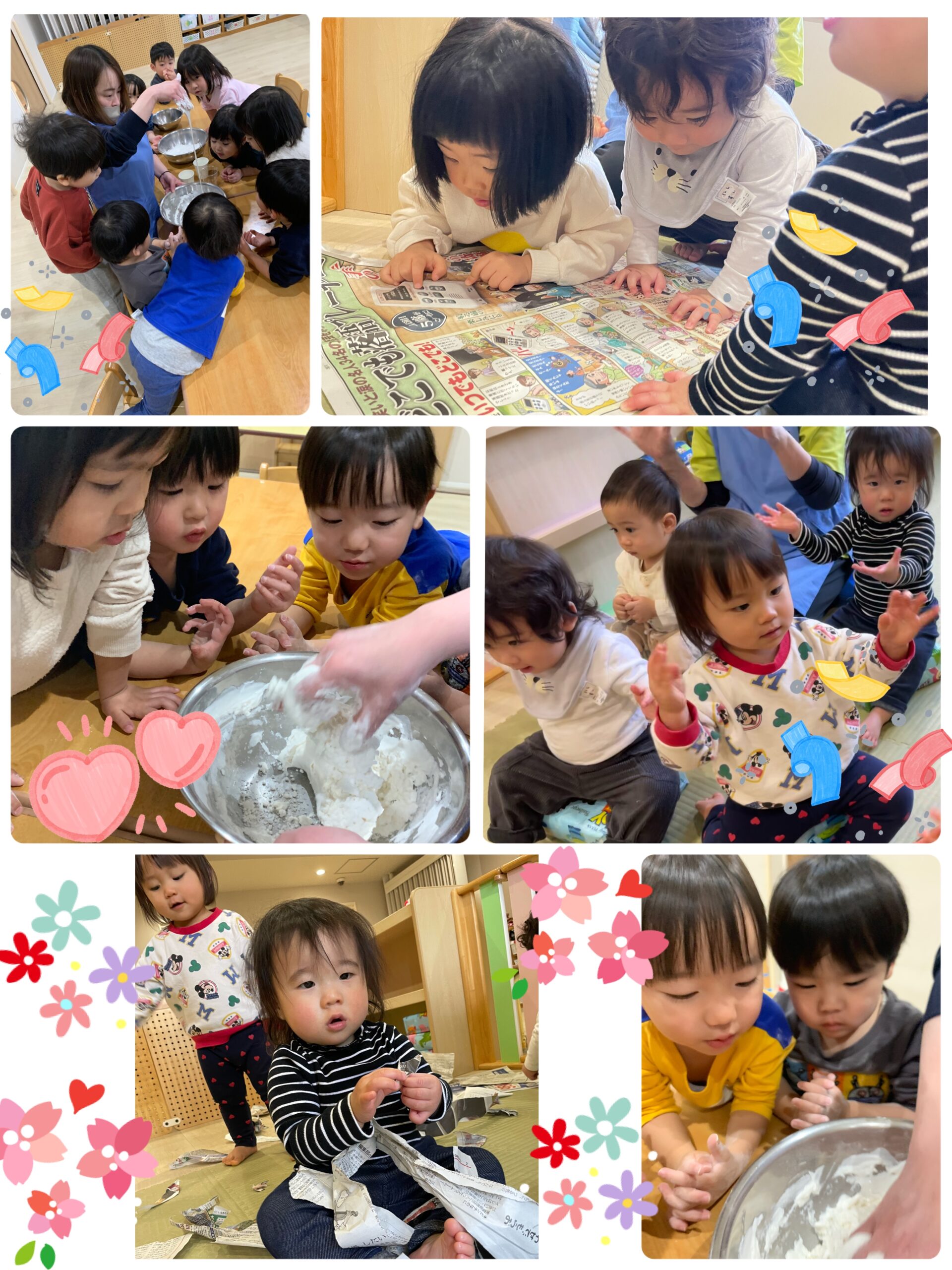 つき組さんはだんご粉を使って感触遊びをしました(๑・̑◡・̑๑)粉のサラサラした感触や、だんごになったモチモチの感覚を楽しんでいましたよ。