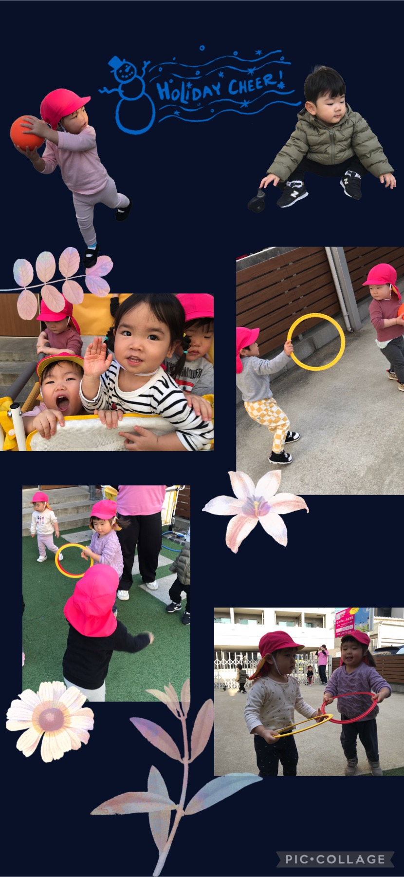 今日は0.1歳児のお友達は園庭で遊びましたよ🌷輪っかやボールを用意てお友達と楽しみました♪靴下や靴も自ら履こうと頑張っています!少しずつできるように練習しているところです🌸