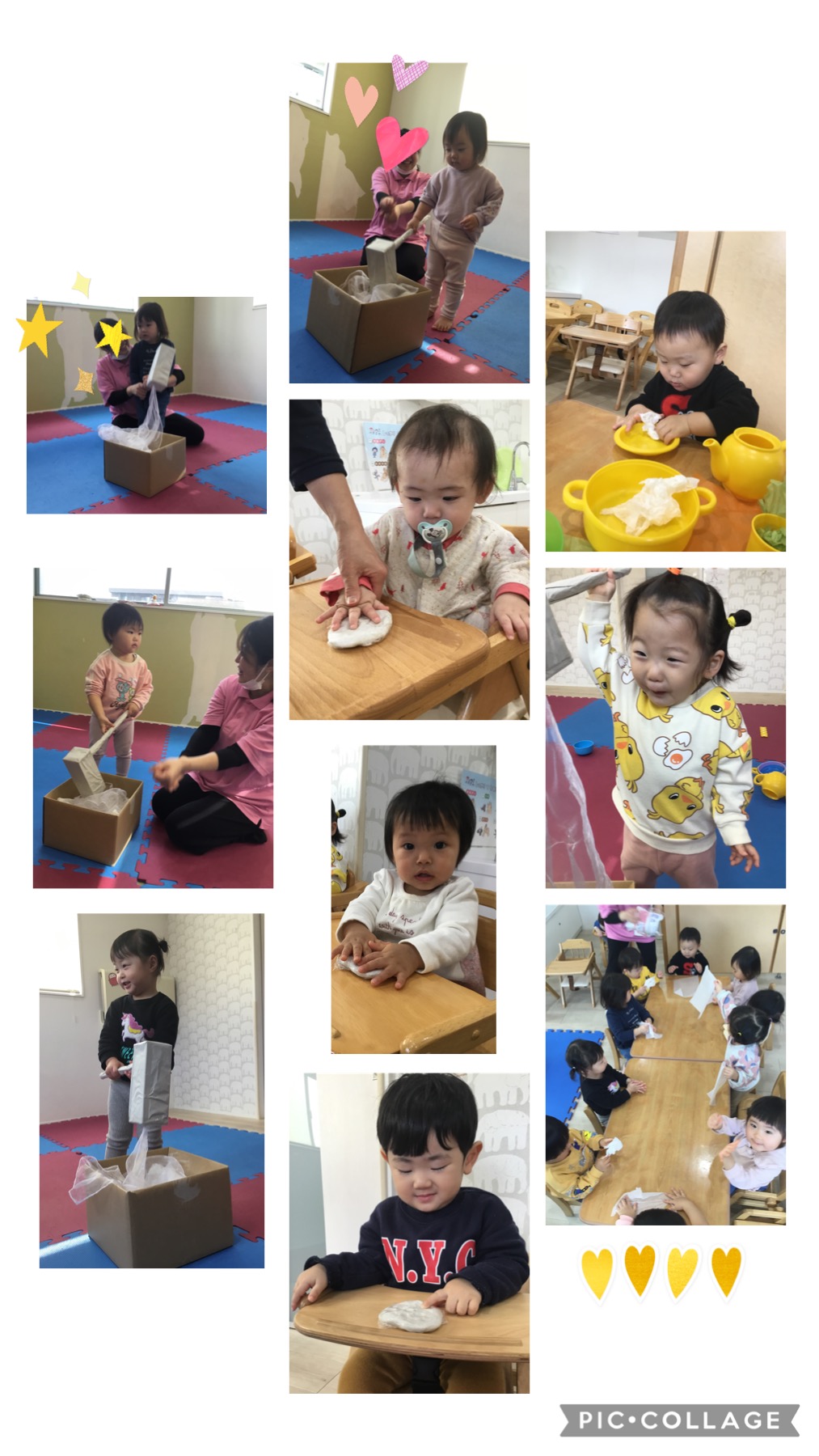 0.1歳児クラスのお友達は、粘土をお餅に見立てて、お餅つきやお餅の感触遊びをしました。柔らかいお餅の感触に大喜びでしたよ✨