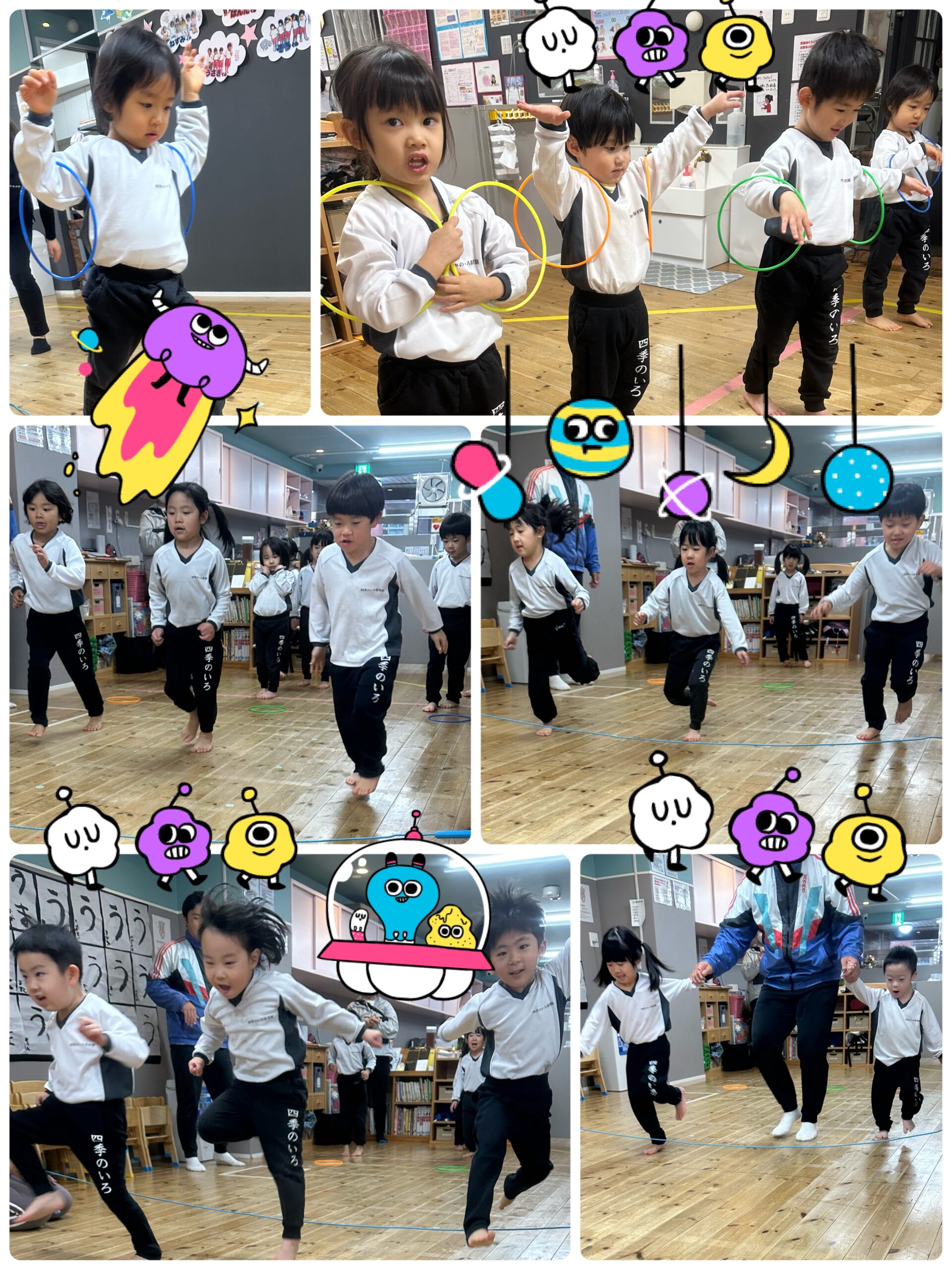 お友だちと一緒に「よ~いスタート!」にこにこでフープに入ったり、紐をジャンプしたりしました。
