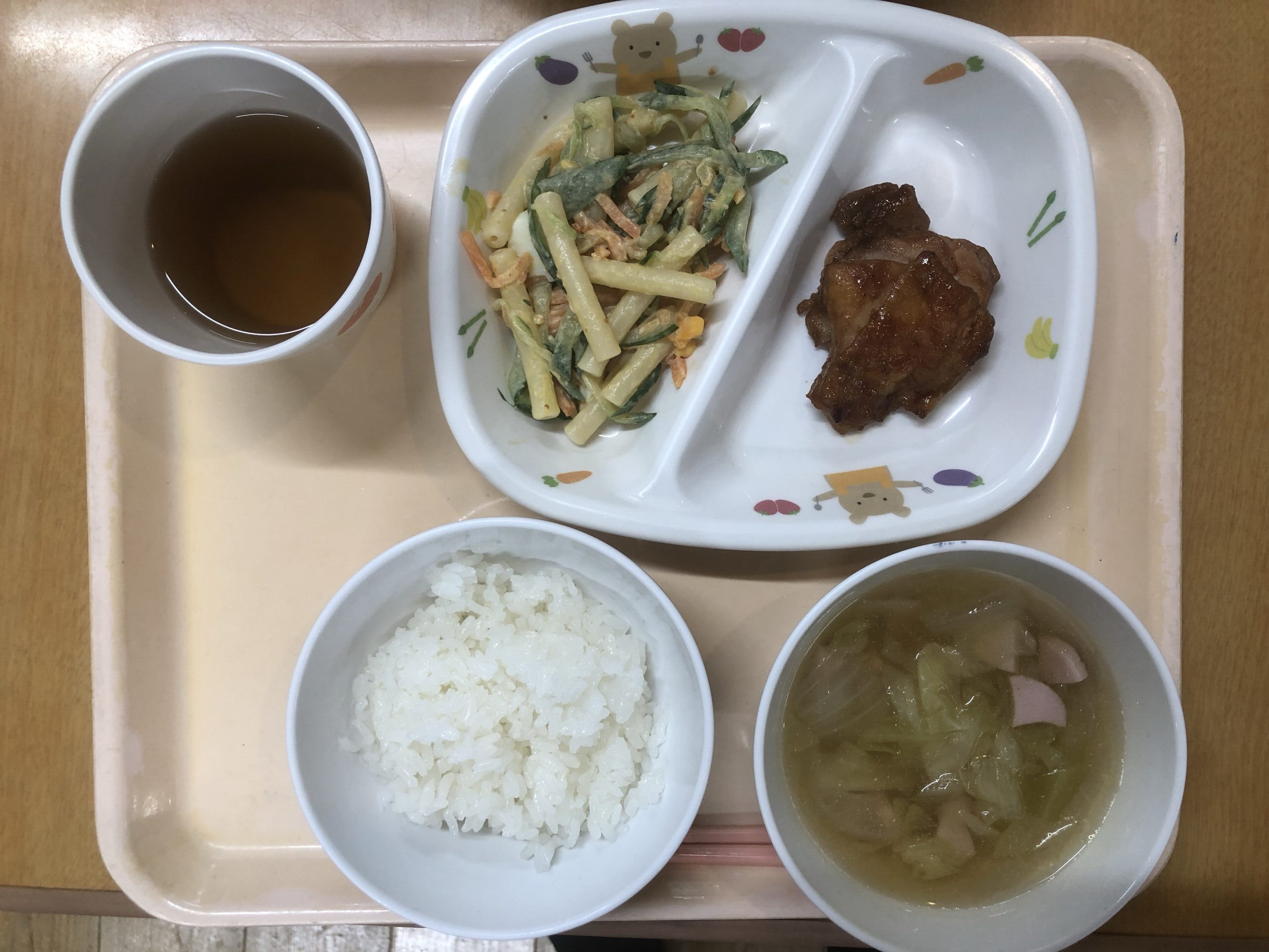 ご飯、鶏肉のケチャップ煮、マカロニの柔らか煮、キャベツのスープ