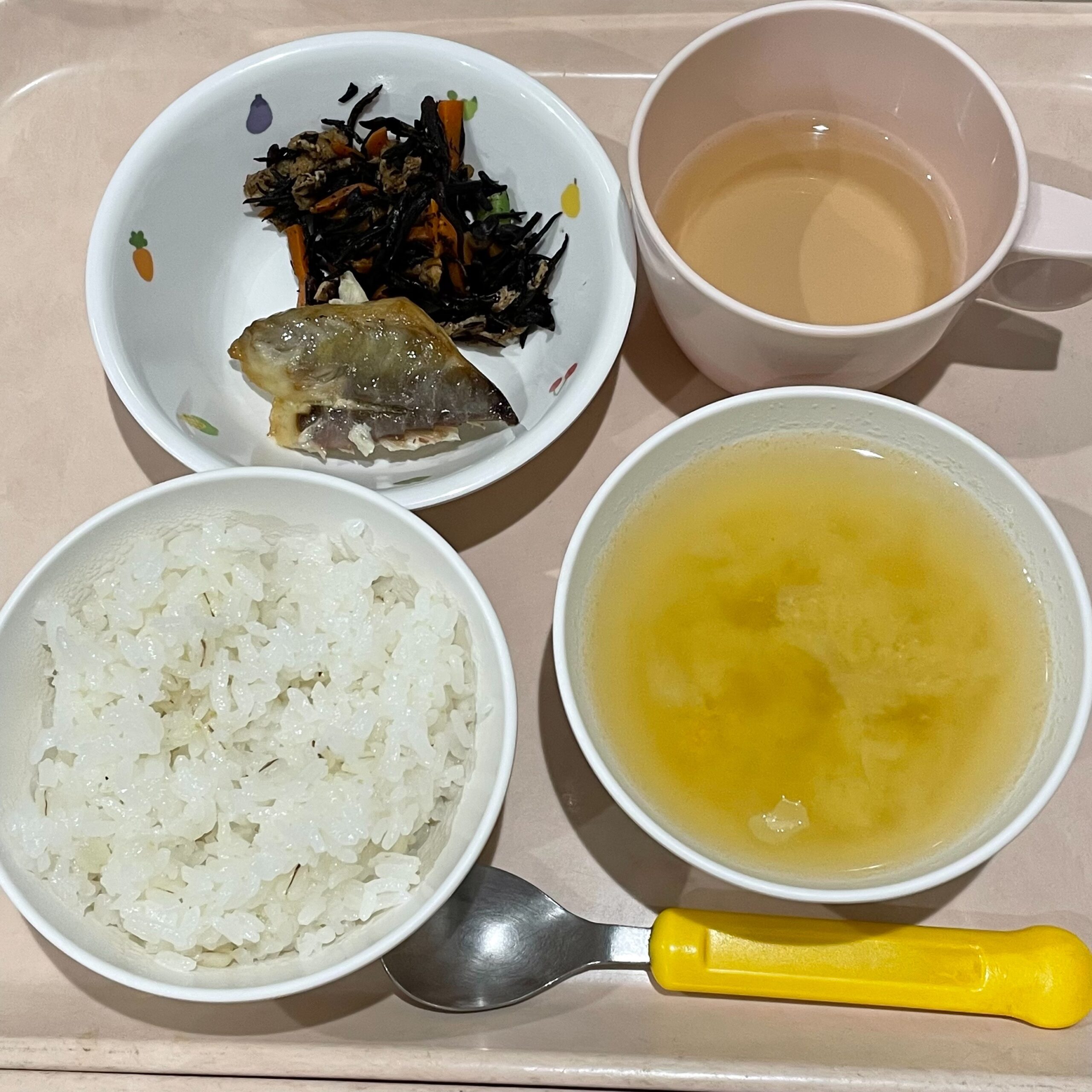麦ごはん、みそ汁、さばの塩焼き、ひじきの煮物