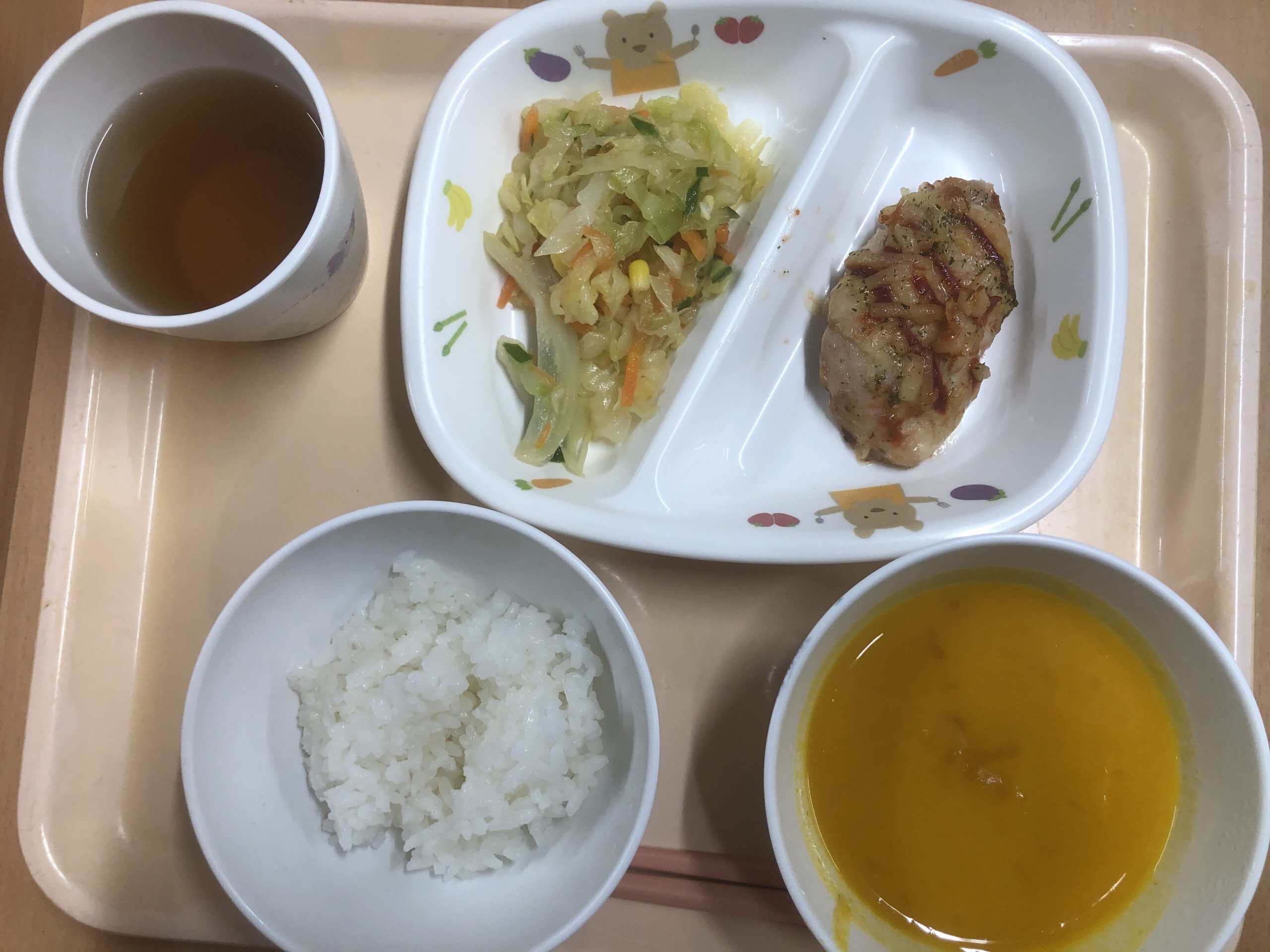 ご飯、ピザ風チキン、キャベツサラダ、パンプキンポタージュ