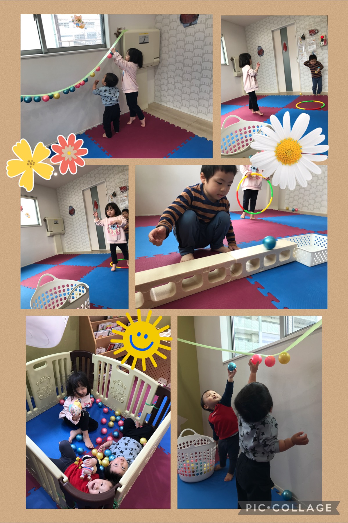 みんなでボールを使って、テープにくっつけたり、カゴに入れてみたり…