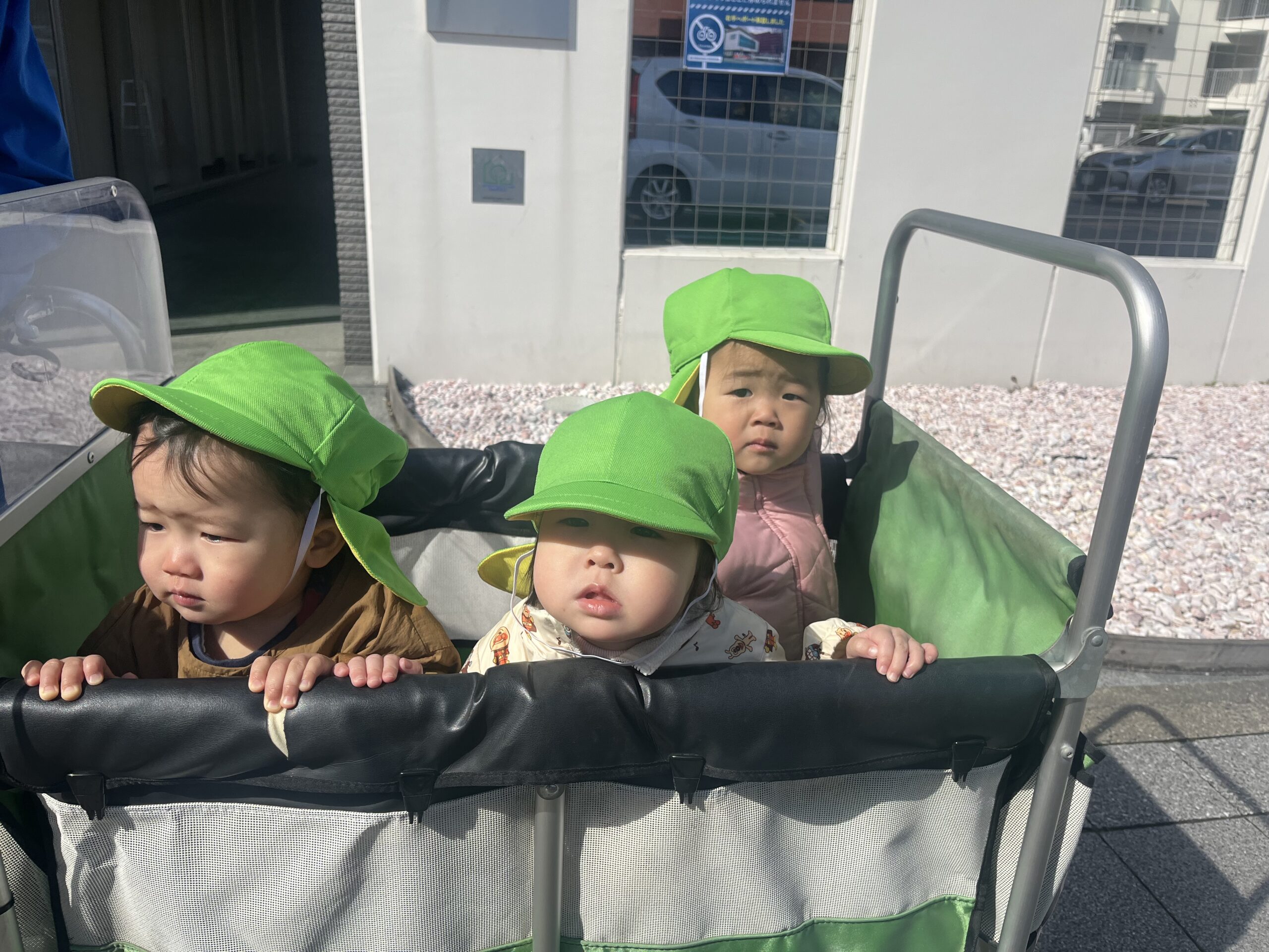 日は差していましたが、風が冷たく鼻水が出ている子どももいたため、園周辺をお散歩しました😊子ども同士でおしゃべりしたり、飛行機雲を見つけて指を差したり、楽しい時間です✨道端に咲いているお花を見つけ、顔を近づけて観察していましたよ🌸