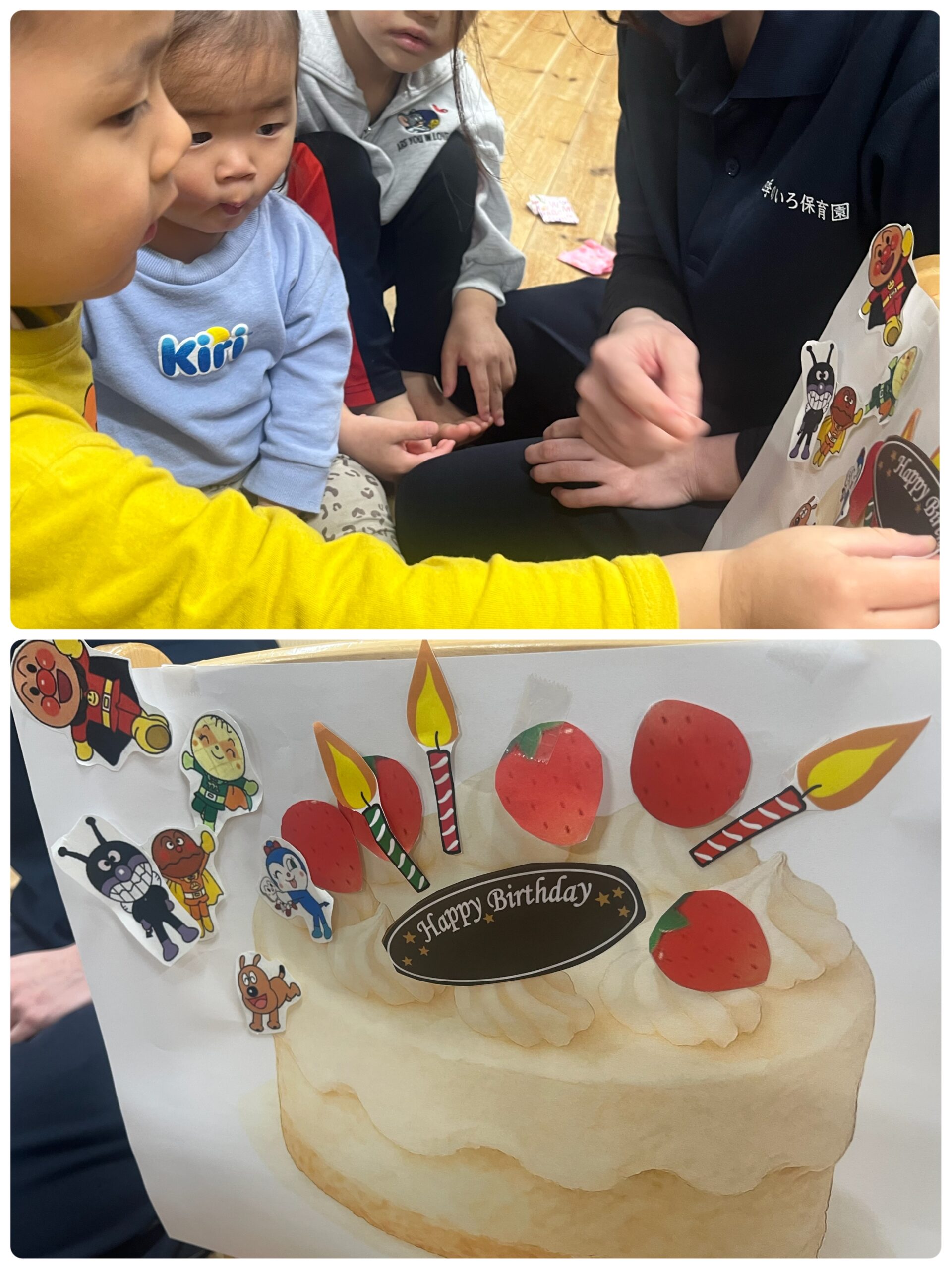 いちごやアンパンマンのキャラクターが出てきました💓実は、今日と明日お誕生日のお友だちがいたので、ケーキのパーツが入っていたのです❤️みんなでケーキの台紙にいちごやろうそく、アンパンマンたちを貼り、飾り付けしましたよ🥰