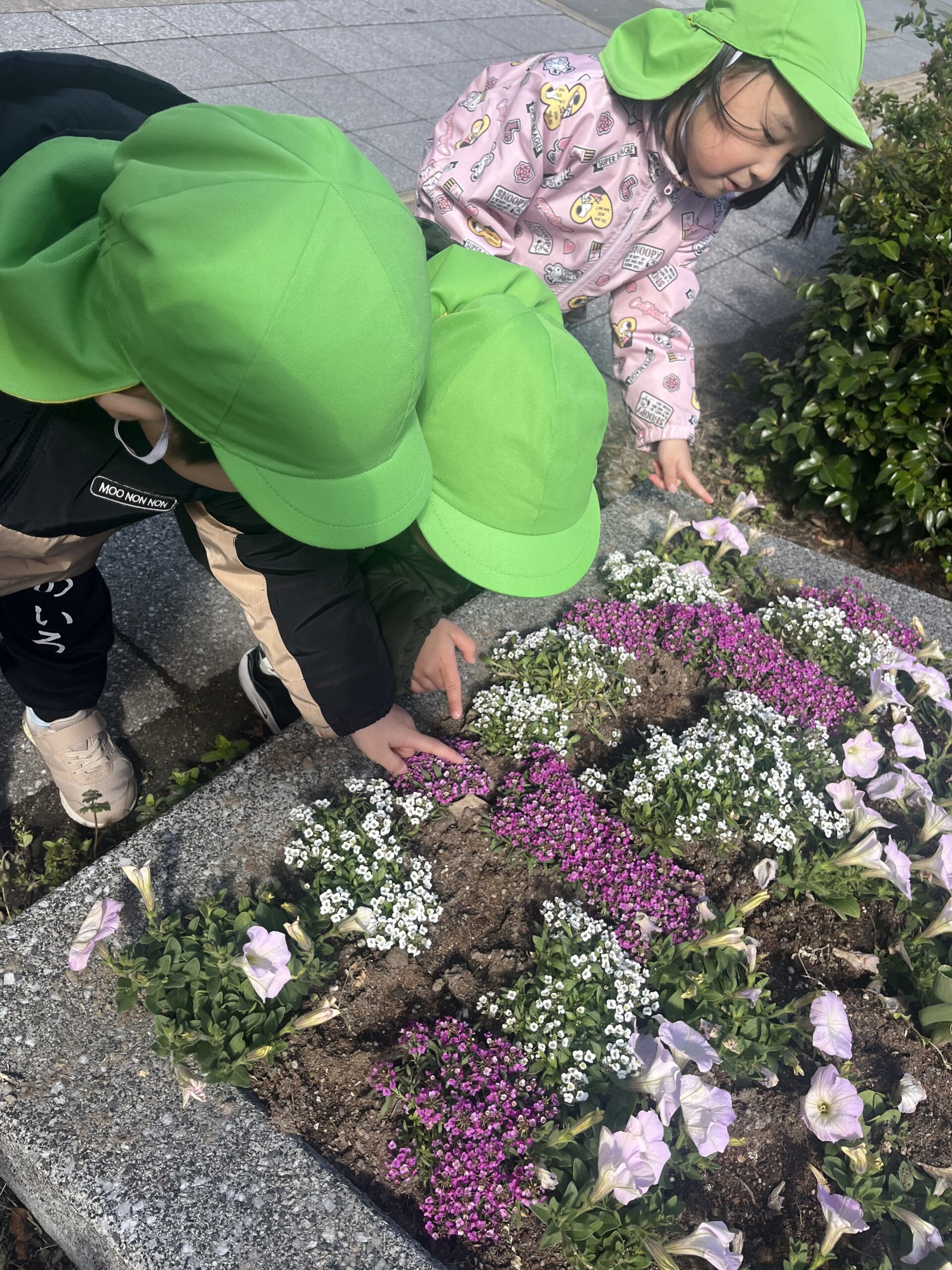 日は差していましたが、風が冷たく鼻水が出ている子どももいたため、園周辺をお散歩しました😊子ども同士でおしゃべりしたり、飛行機雲を見つけて指を差したり、楽しい時間です✨道端に咲いているお花を見つけ、顔を近づけて観察していましたよ🌸