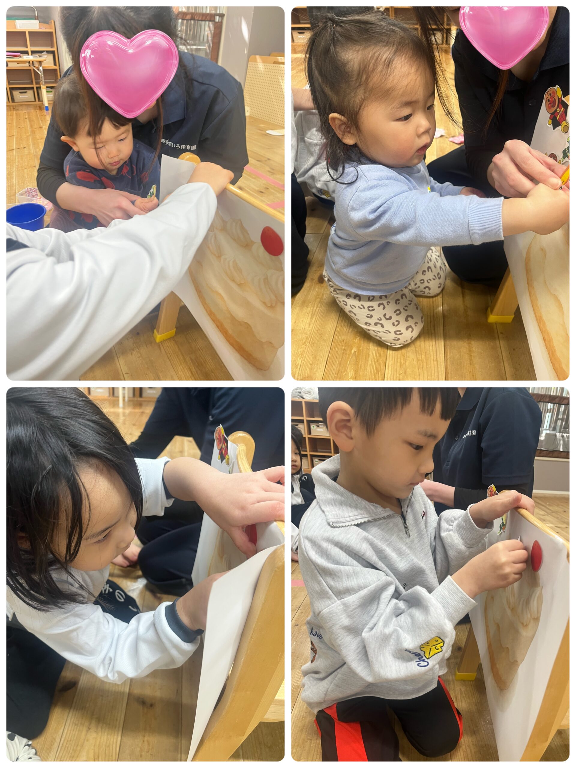 いちごやアンパンマンのキャラクターが出てきました💓実は、今日と明日お誕生日のお友だちがいたので、ケーキのパーツが入っていたのです❤️みんなでケーキの台紙にいちごやろうそく、アンパンマンたちを貼り、飾り付けしましたよ🥰
