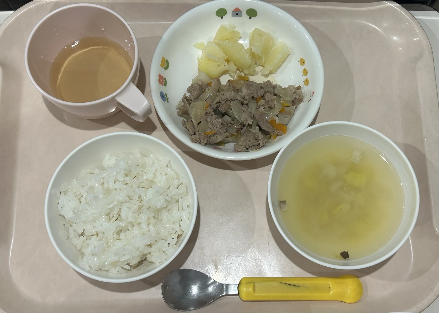 麦ご飯、みそ汁、豚肉のしょうが煮、粉ふきいも