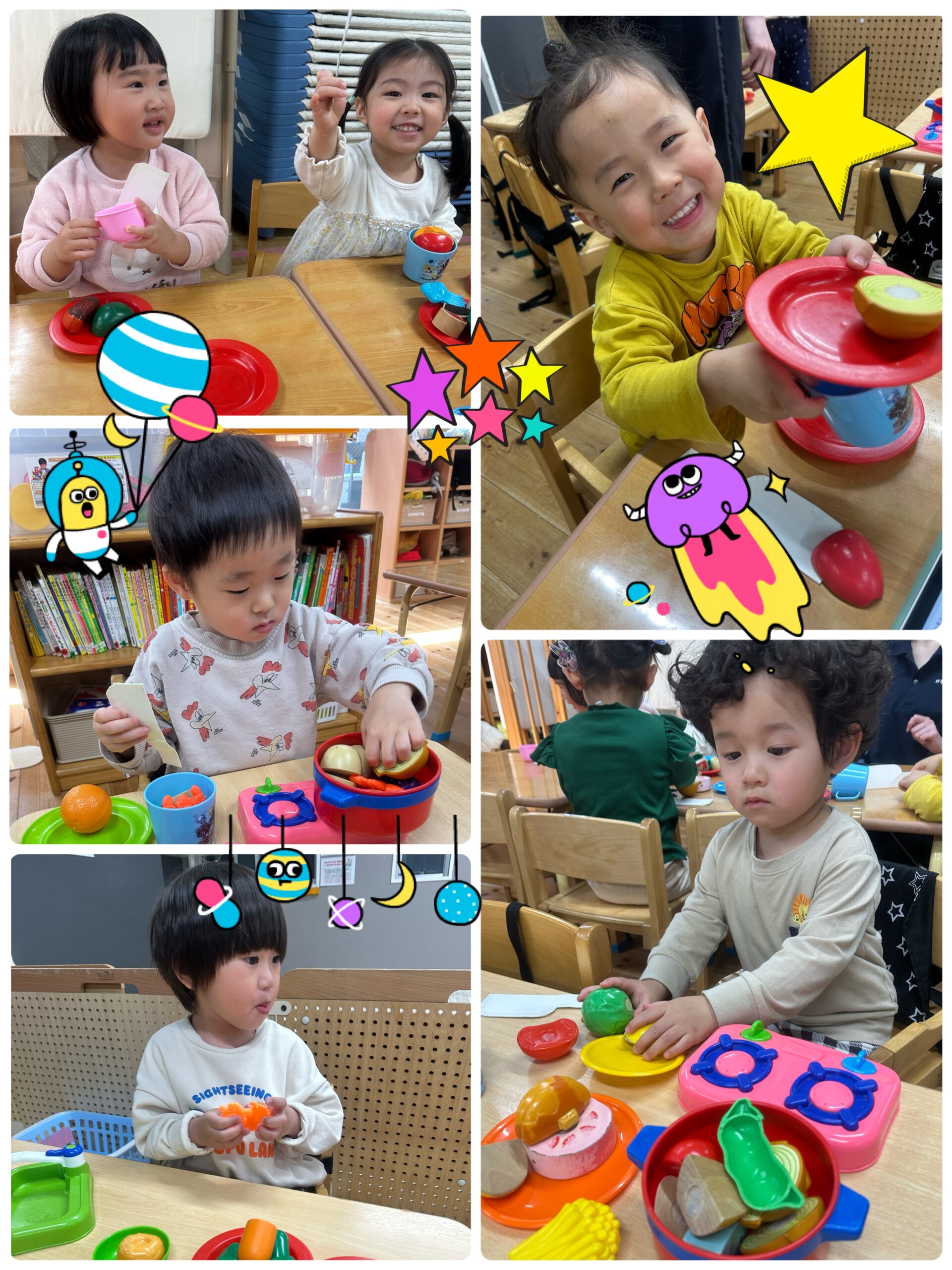先生のお話を聞いてから、机の上に並んだお皿にお気に入りの食べ物を並べて、お友だちとお食事会のようにおままごと遊びを楽しんでいました🥰