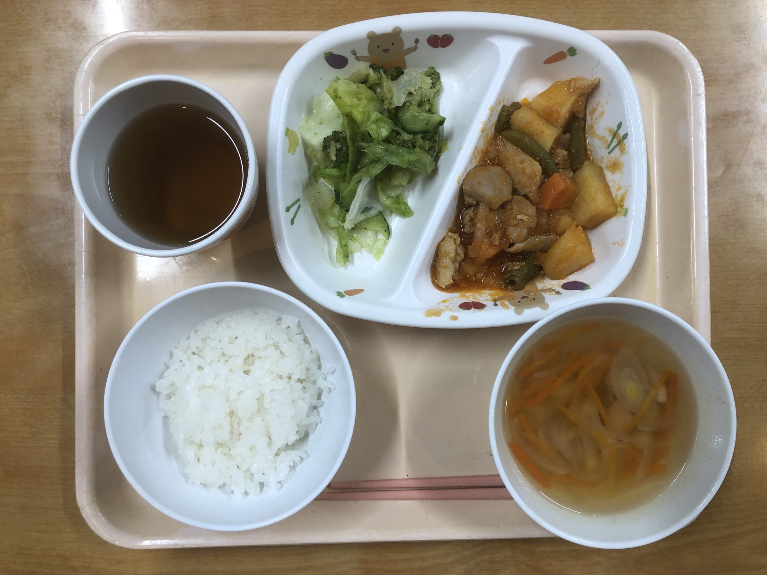 ご飯、鶏肉のケチャップ煮、レタスのくたくた煮、ブロッコリーのスープ