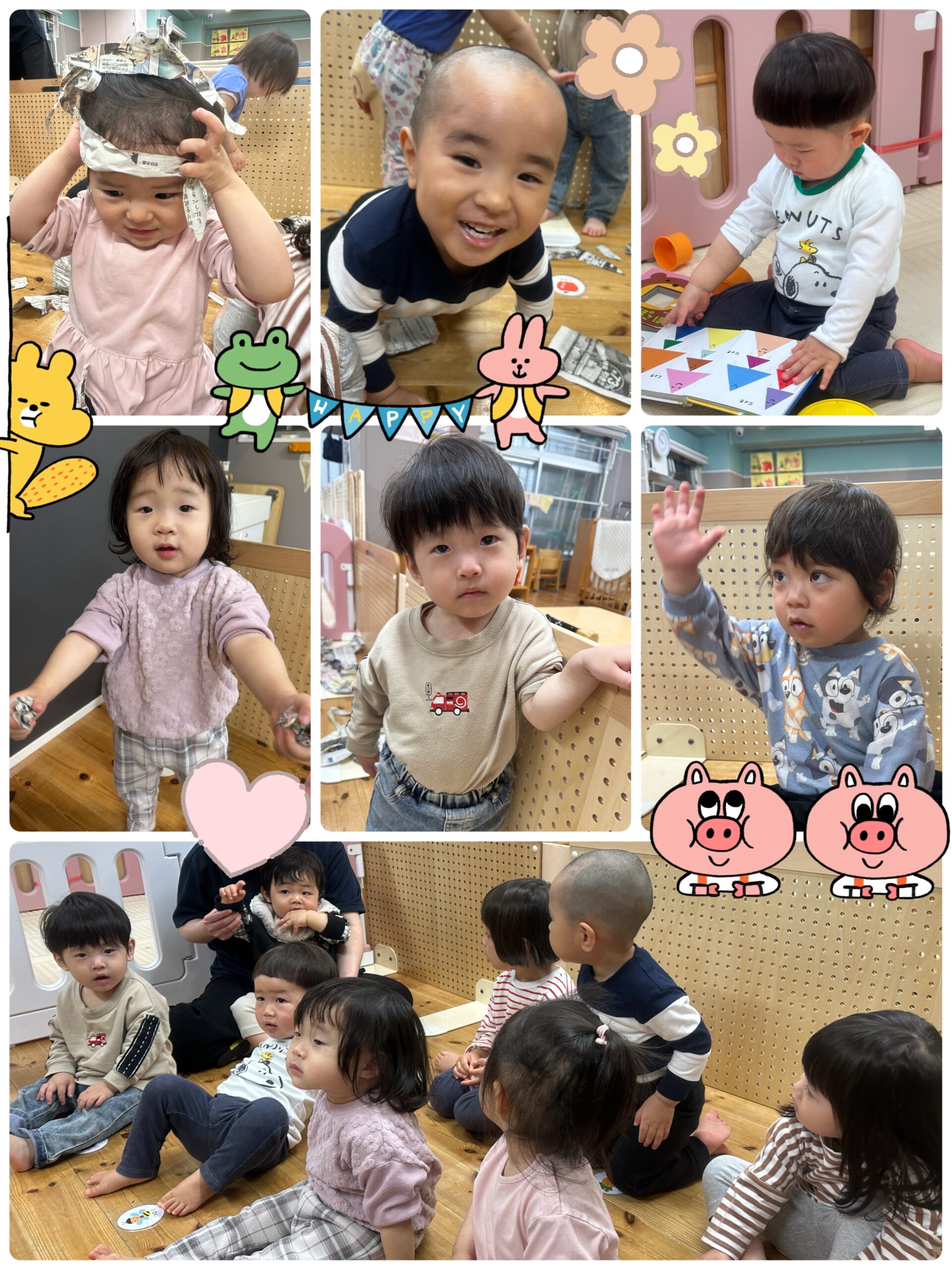 新聞紙をくしゃくしゃに丸めたり、頭につけてカチューシャみたいにしたりと思い思い楽しみました。