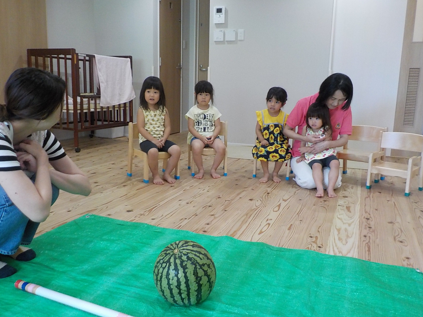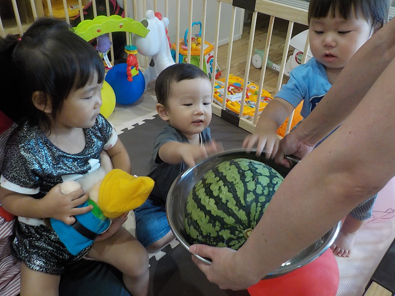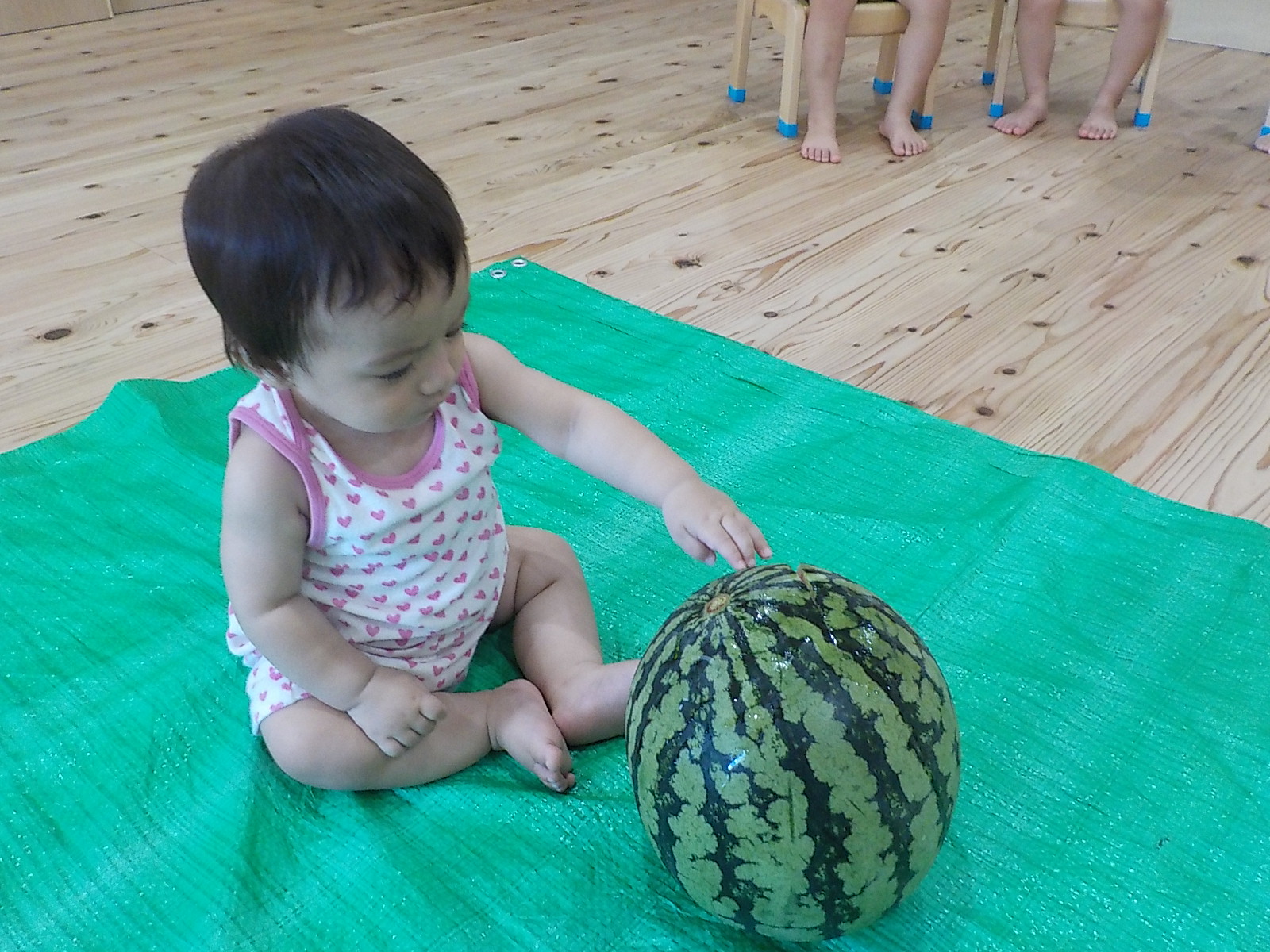 スイカって大きいね~!!!まん丸だね~!!!と興味津々の子どもたち(^^)/