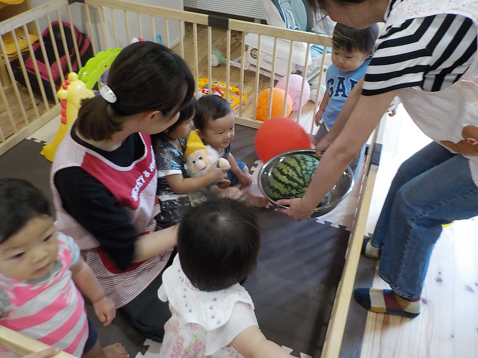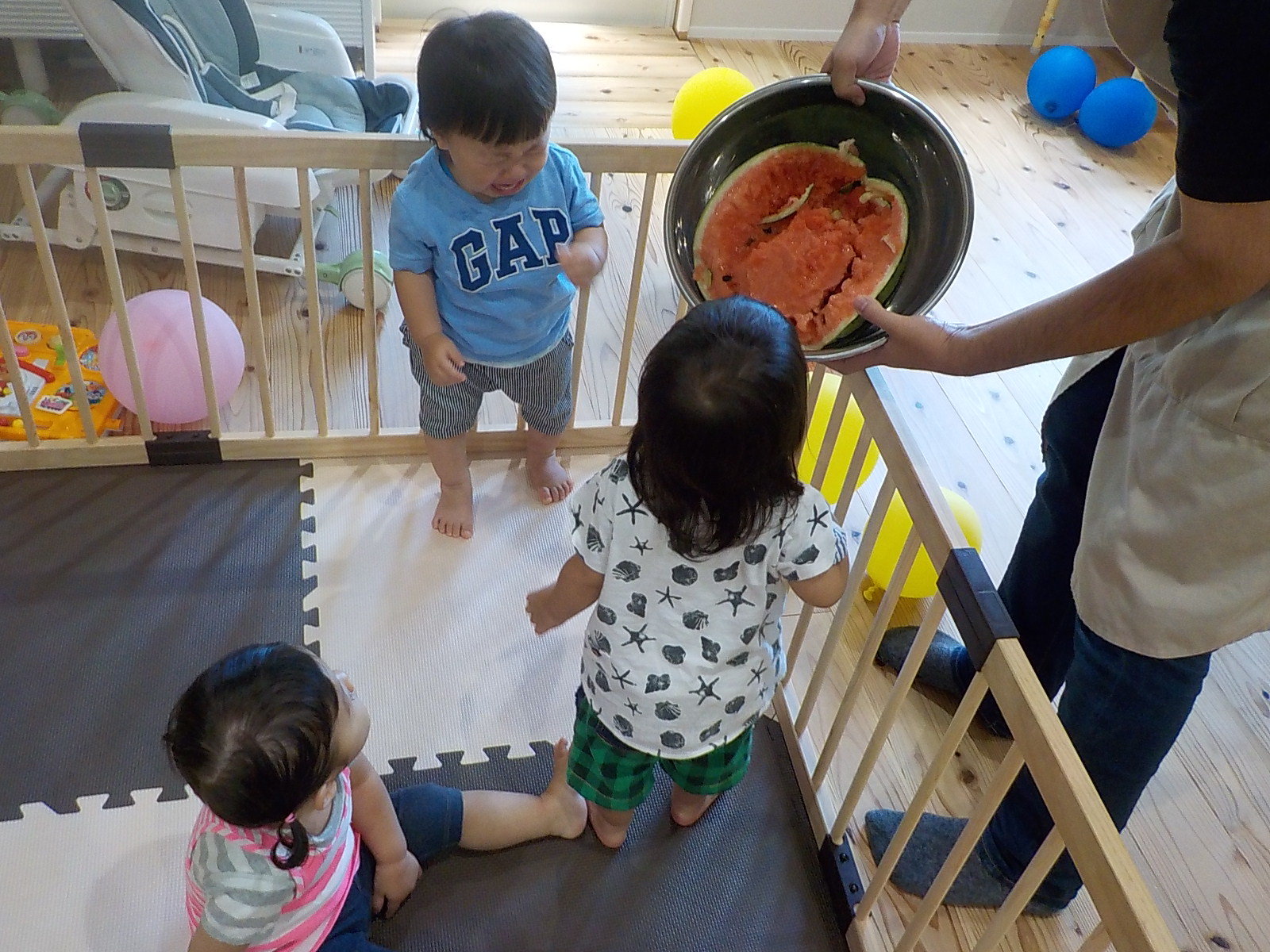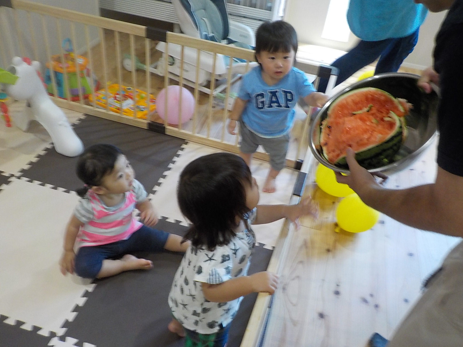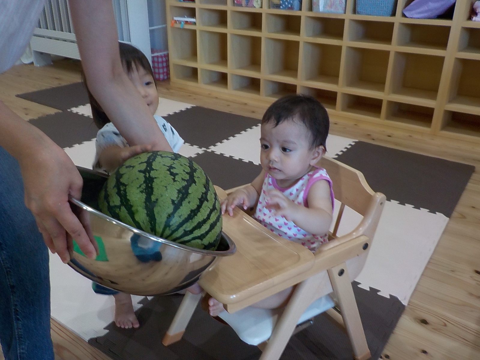 スイカって大きいね~!!!まん丸だね~!!!と興味津々の子どもたち(^^)/
