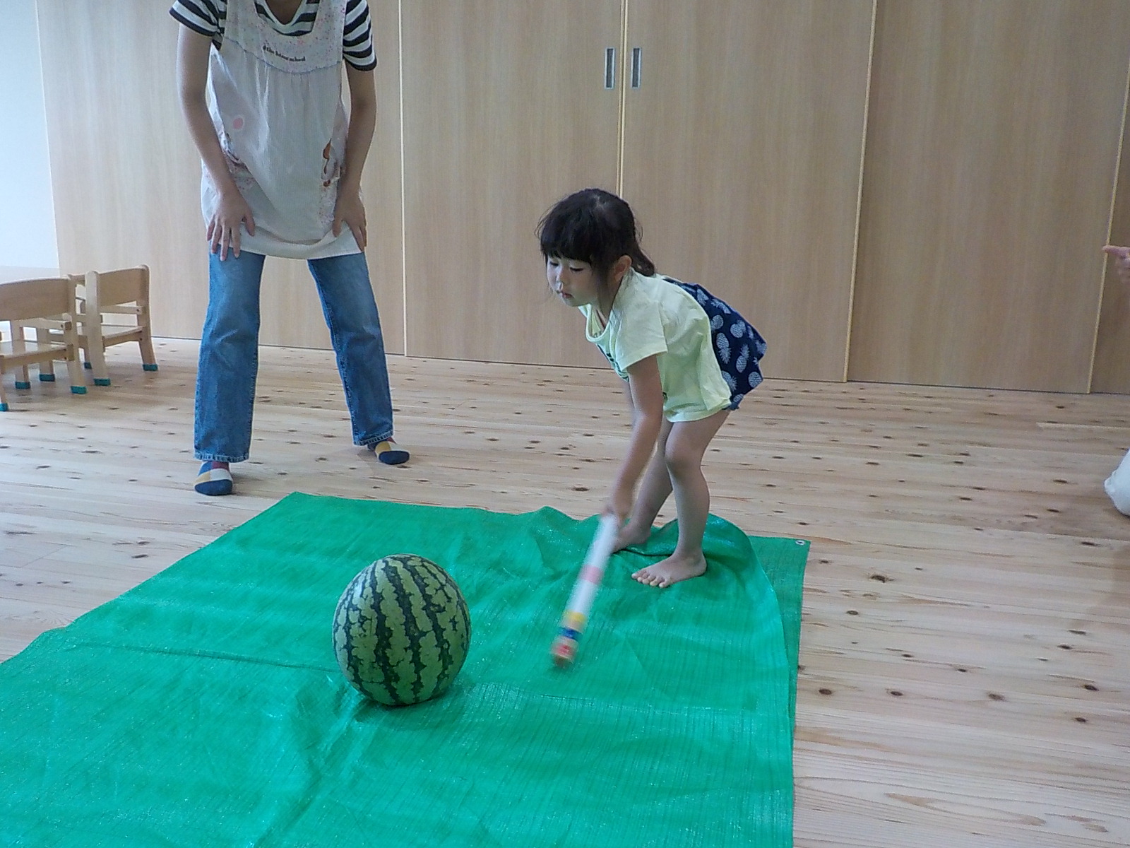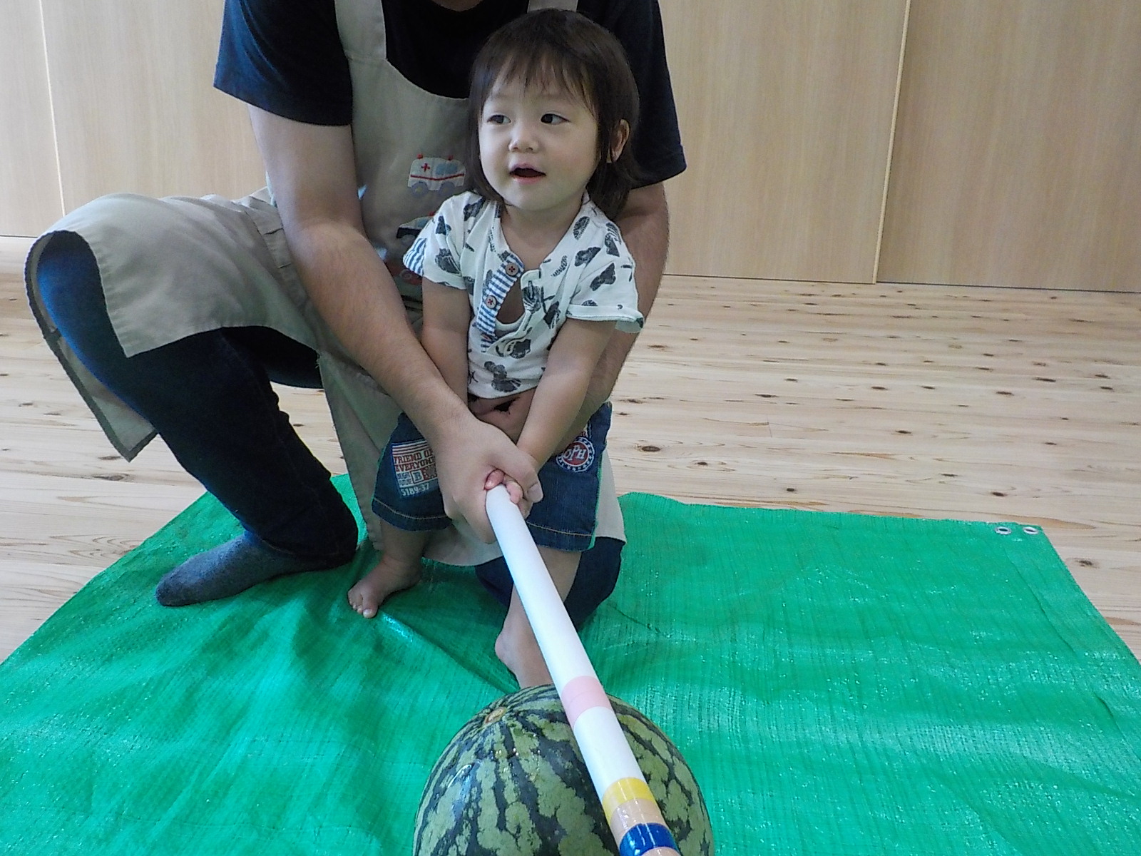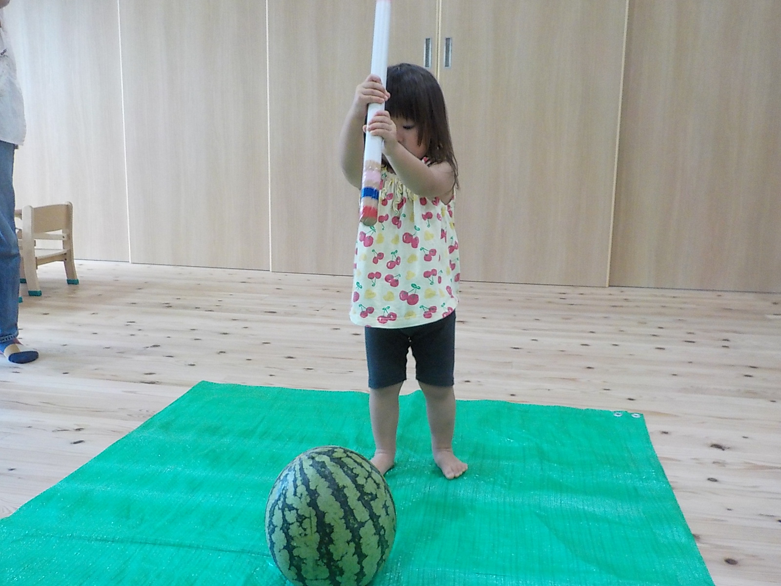 さあ、みんなで力を合わせたけれど、すいかさんなかなか割れてくれません。。( ;∀;)