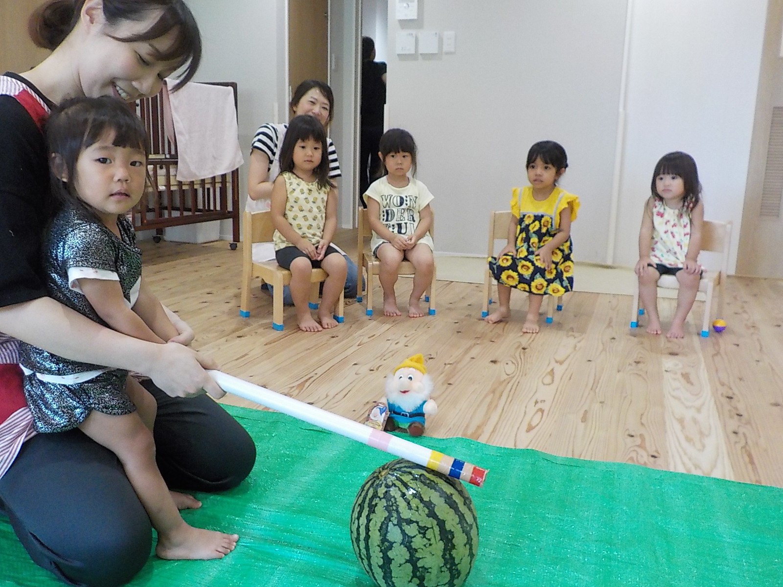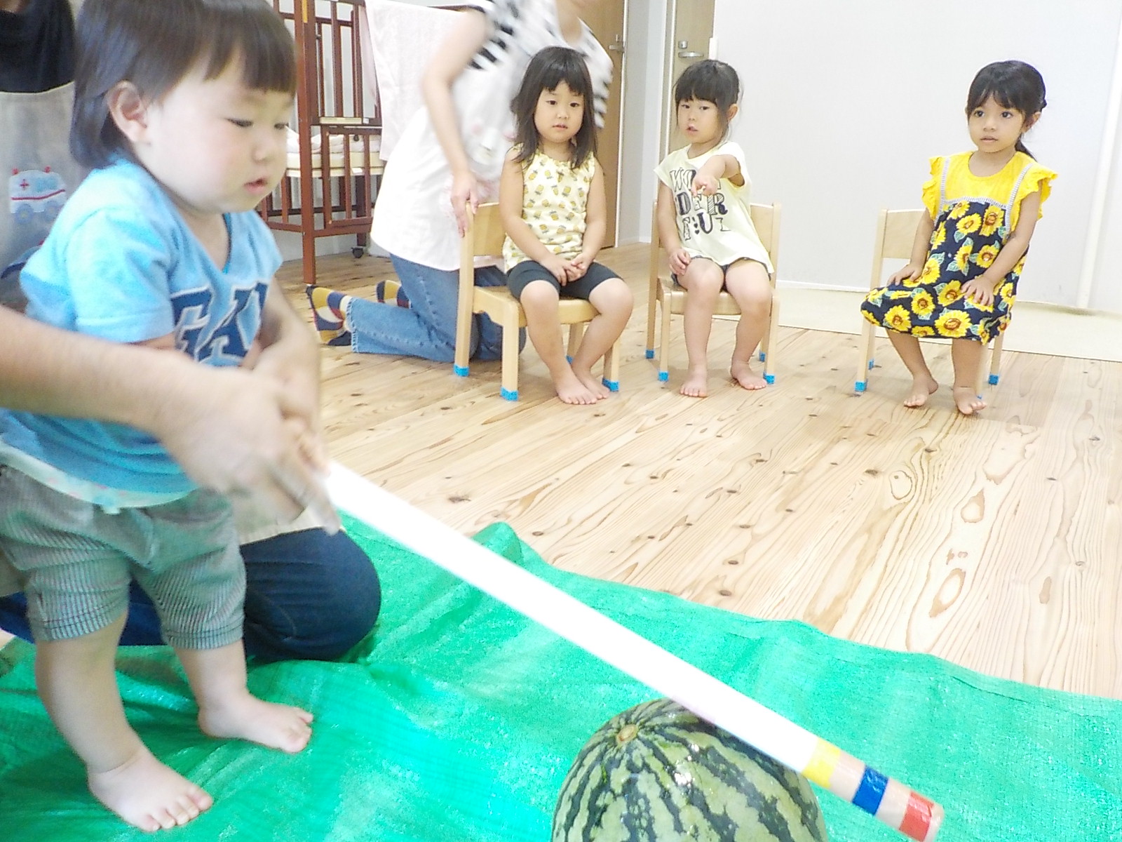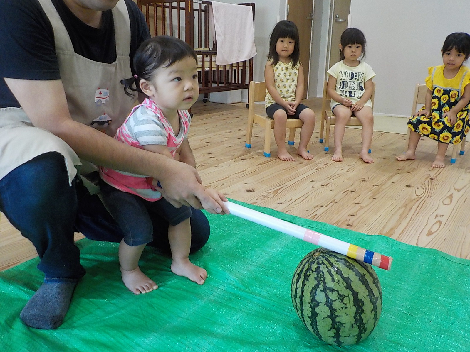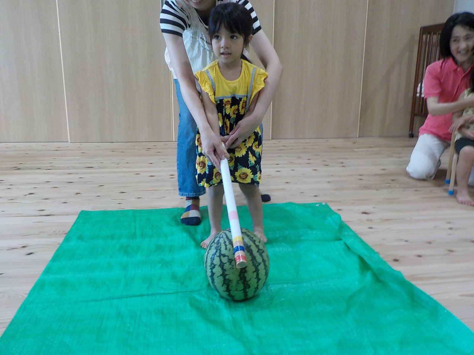 さあ、みんなで力を合わせたけれど、すいかさんなかなか割れてくれません。。( ;∀;)